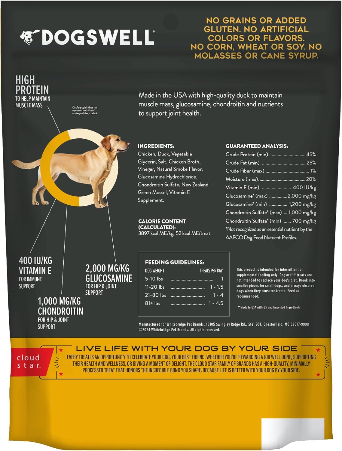 Chicken, Duck, Vegetable Glycerin, Salt, Chicken Broth, Vinegar, Natural Smoke Flavor, Glucosamine Hydrochloride, Chondroitin Sulfate, New Zealand Green Mussel, Vitamin E Supplement.