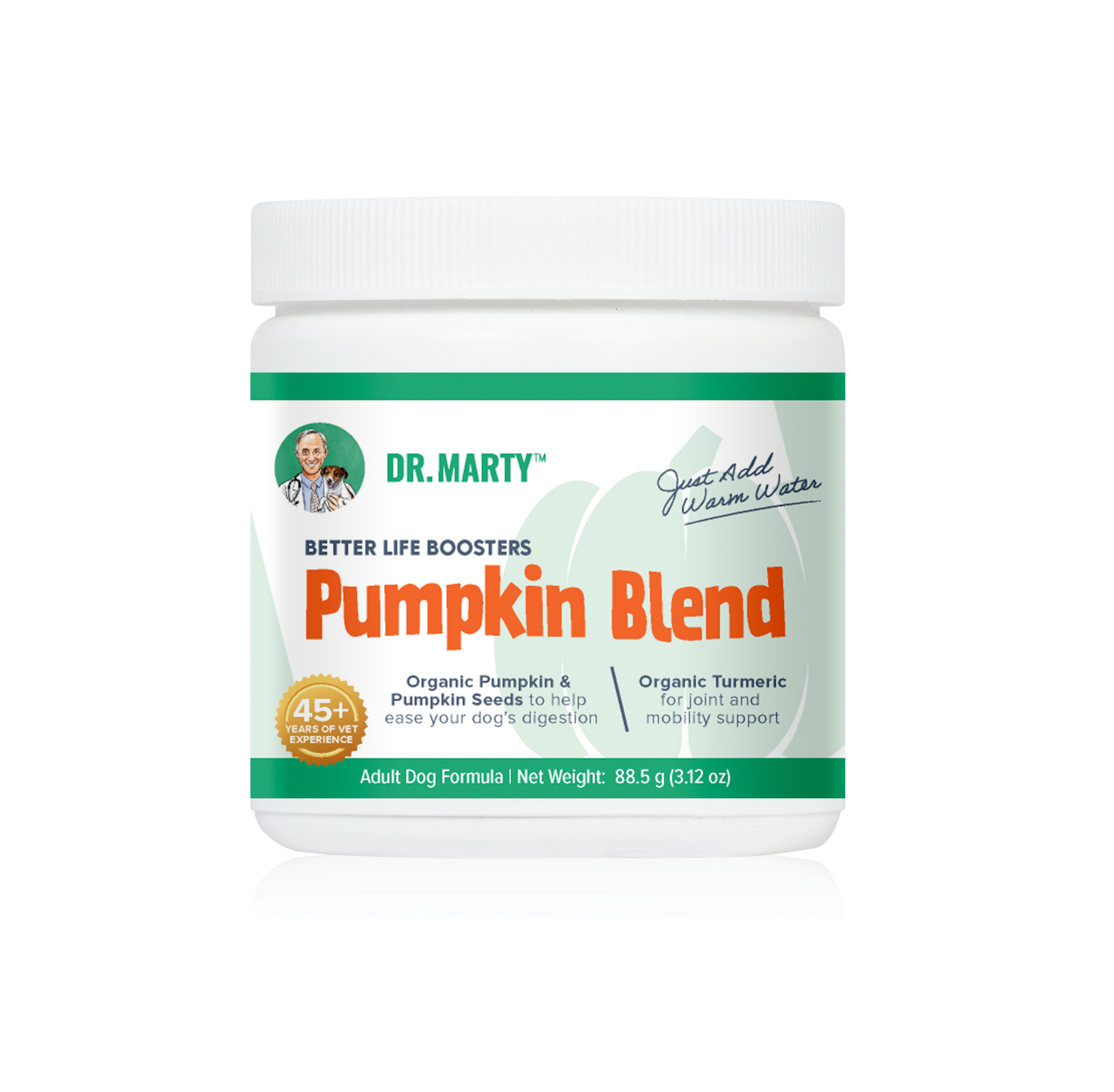Made with organic pumpkin, collagen-rich turkey bone broth, and organic turmeric, this powdered formula helps support firm poops, easy digestion, and strong joints. And your dog will love the delicious flavor!