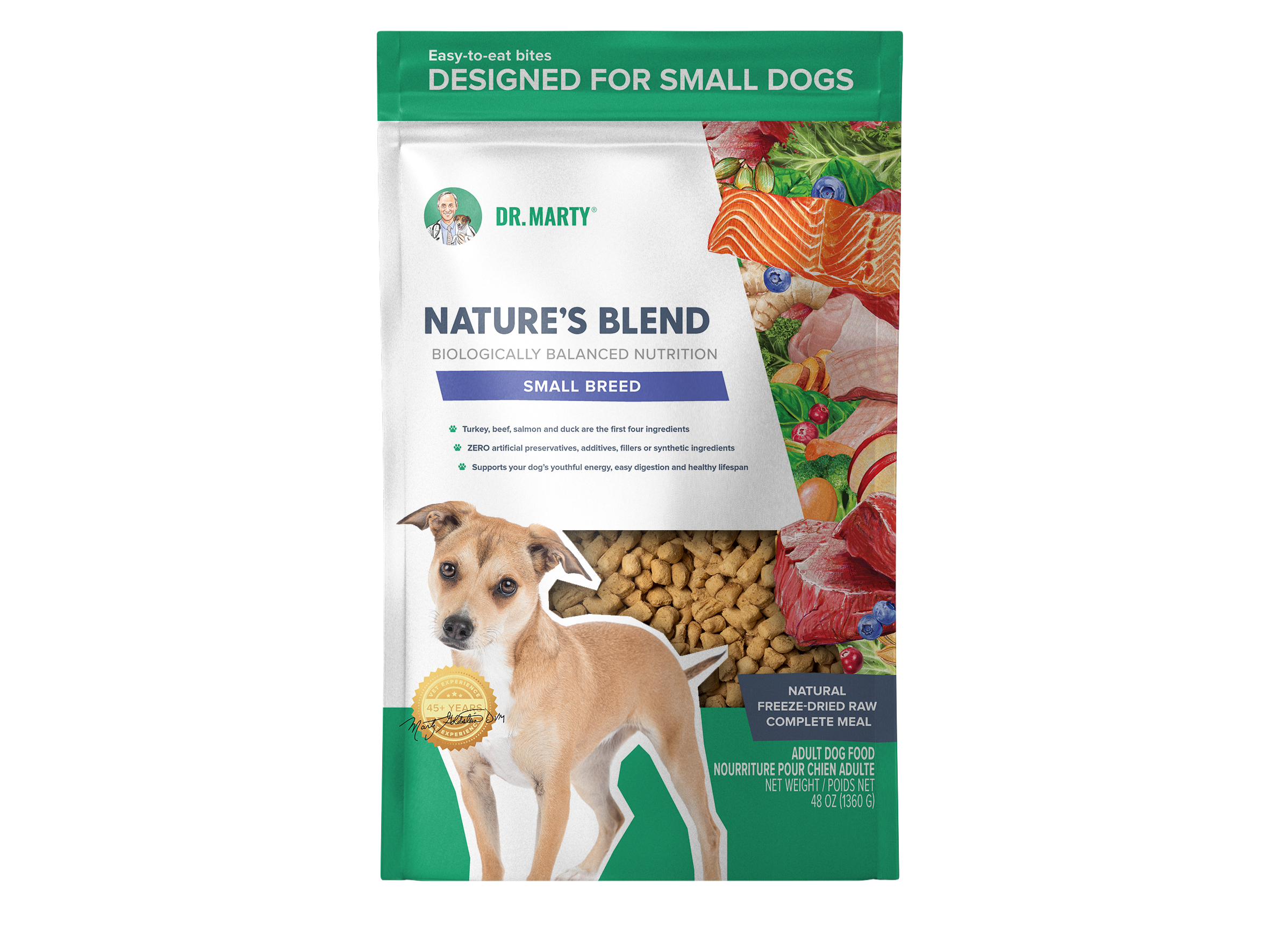 Dr. Marty's Nature’s Blend – Small Breed is the same incredible freeze-dried raw formula dogs love, but crafted into smaller, bite-sized pieces designed specifically for small breed dogs. Each batch is made with premium-quality raw meat with hand-selected fruits and vegetables to give your dog the nutrition they need for a long, healthy life.