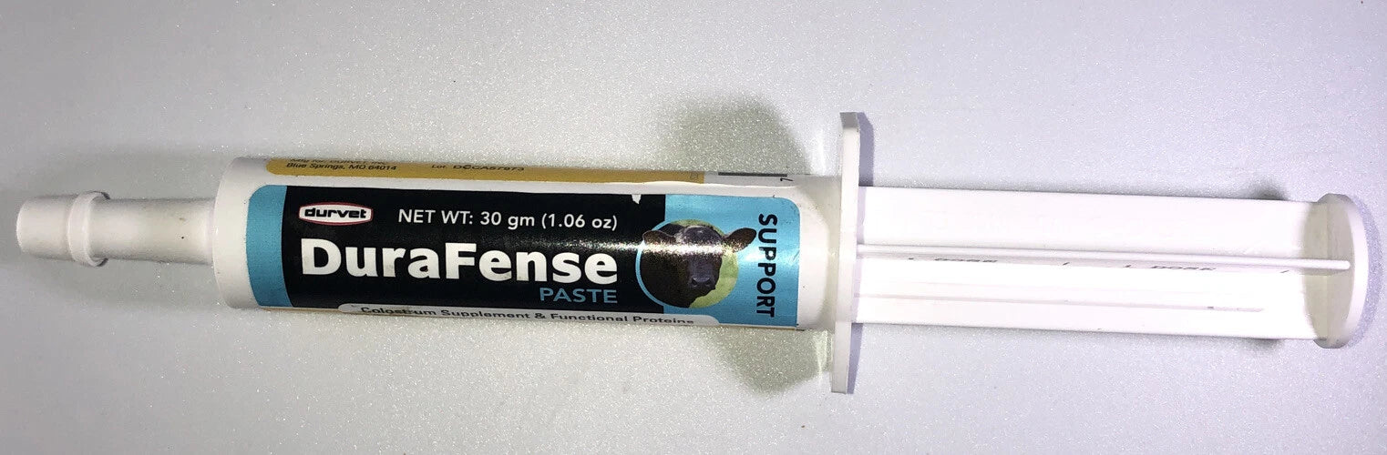 Durvet® DuraFense Paste is a colostrum supplement with functional proteins designed for newborn beef and dairy calves, providing essential nutrients and gut support when colostrum intake is insufficient. It contains live (viable) direct-fed microorganisms, high-quality bovine colostrum, and egg-based functional proteins to promote digestive balance and support immunity.