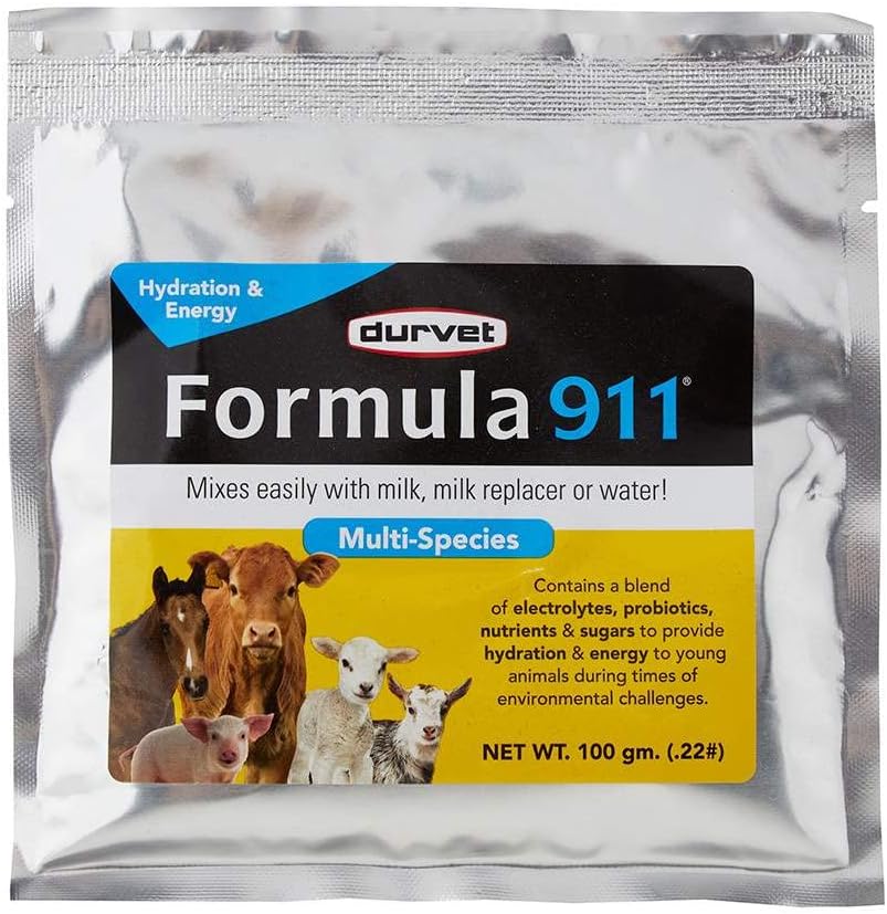 Formula 911® is a complete supplement designed to provide hydration, energy, and gut support to young animals during times of environmental or physiological stress. It contains electrolytes, nutrients, sugars, and probiotics, including live naturally occurring microorganisms, to support digestion and overall health.