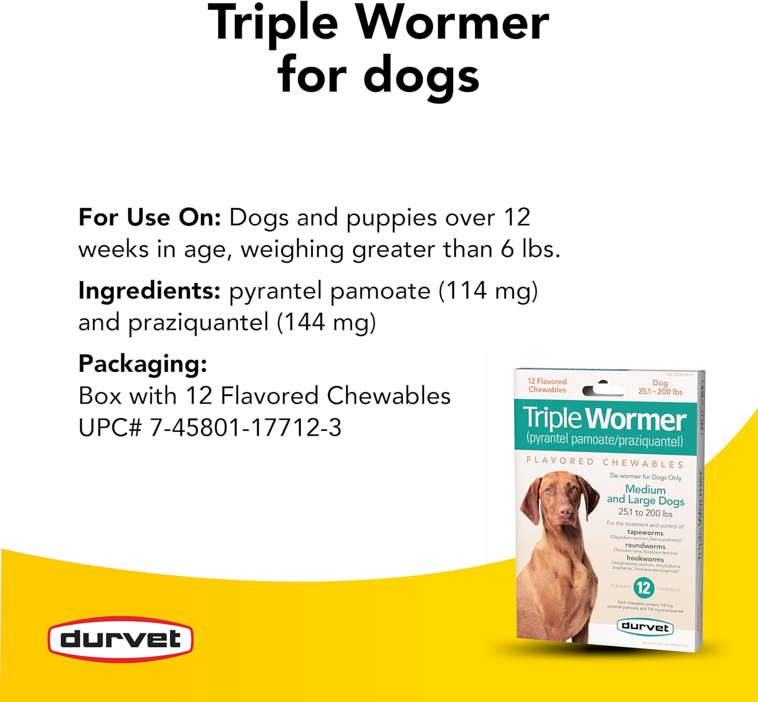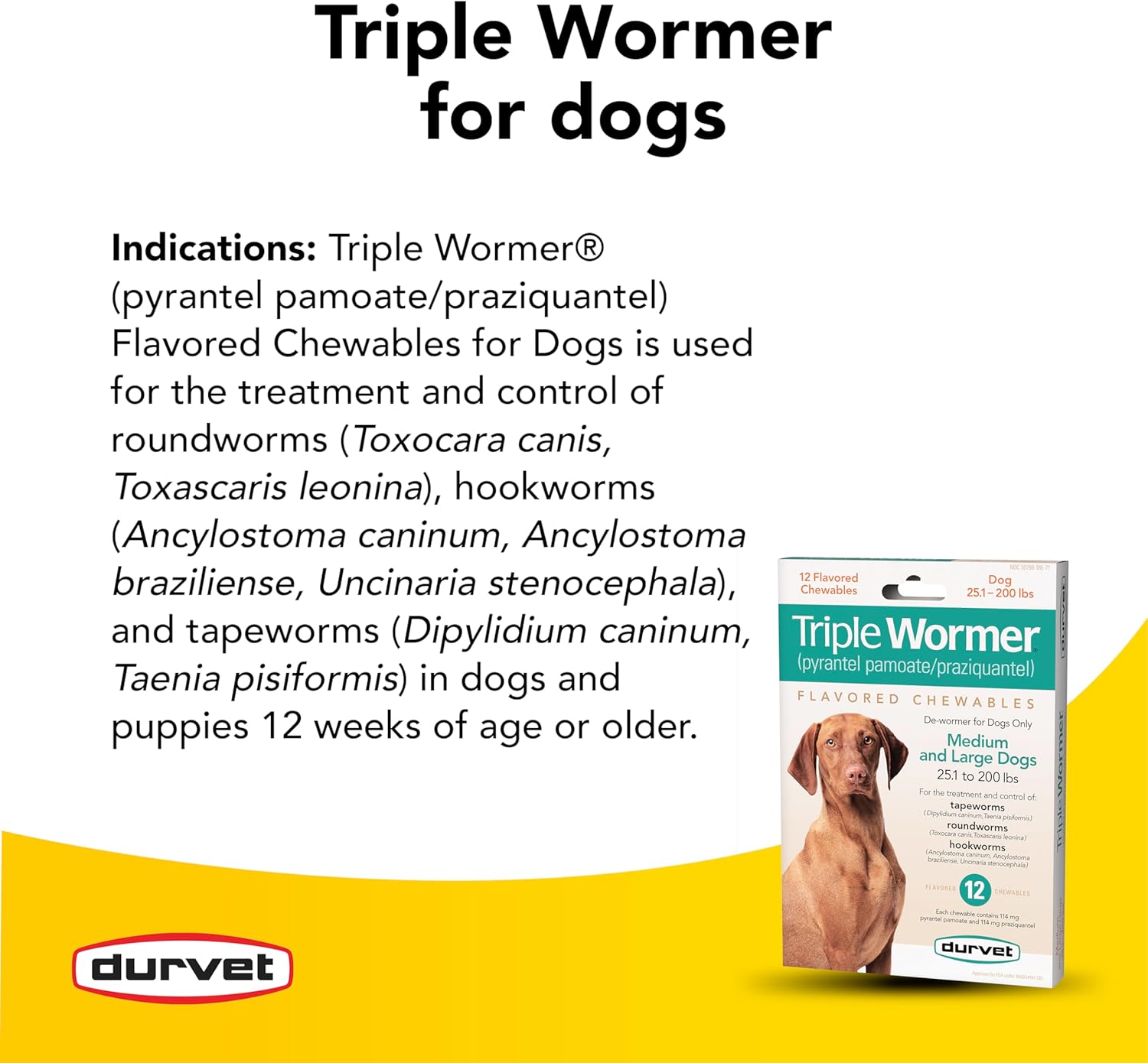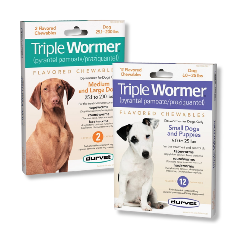 Durvet® Triple Wormer™ is the broadest-spectrum OTC dewormer available for dogs. These convenient, palatable chewable tablets effectively treat and control seven strains of tapeworms, hookworms, and roundworms. No prescription required.