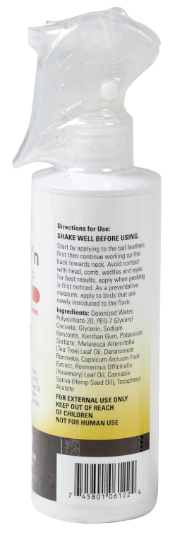 Protect your flock with Durvet® No Pick’n, an easy-to-use hydrogel spray specially formulated to help reduce feather picking and cannibalism in chickens. Infused with tea tree oil, hemp seed oil, and other essential oils, this natural formula soothes irritated skin while discouraging birds from pecking one another.