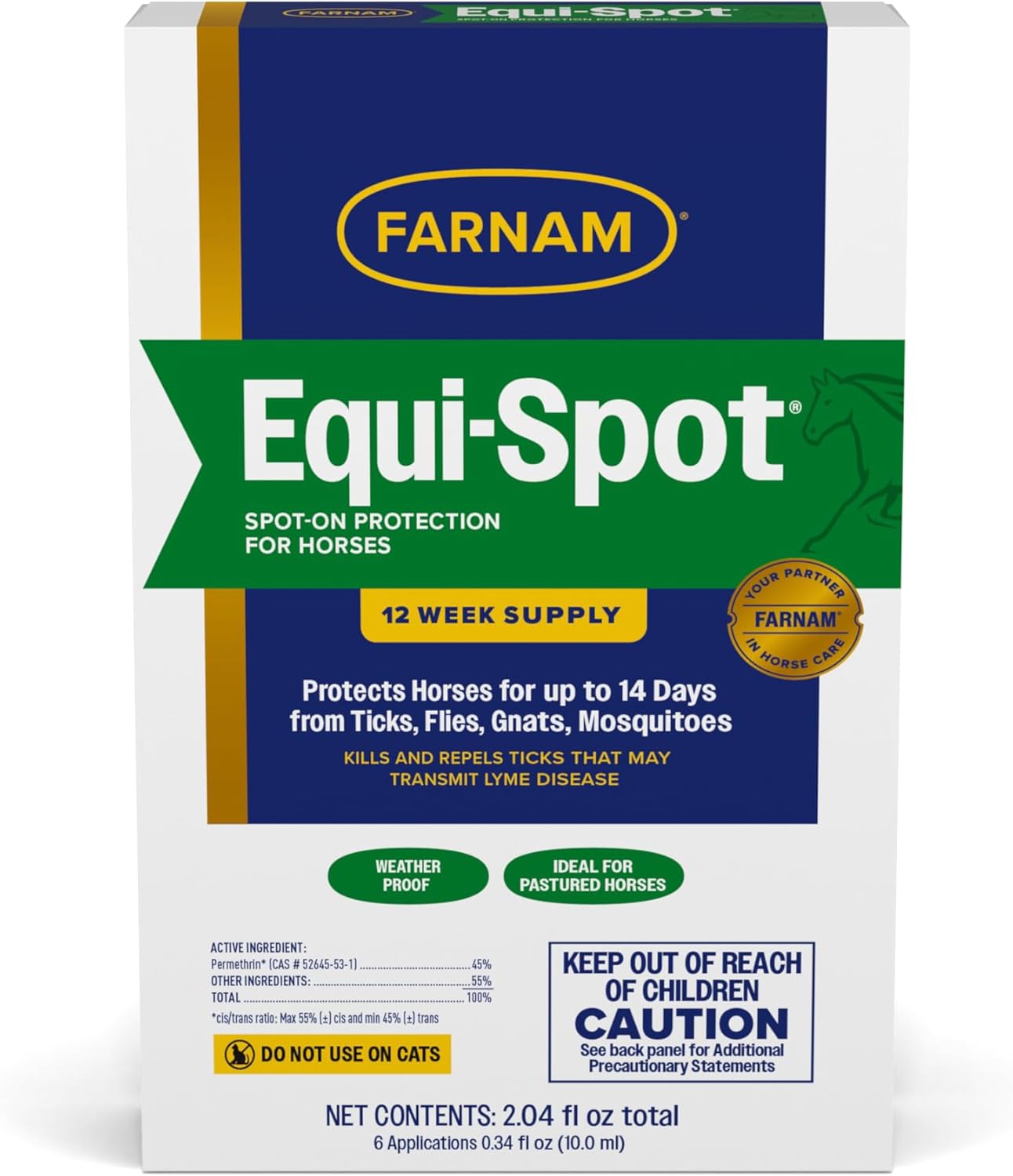 Equi-Spot® Spot-On Protection for Horses — kills and repels flies, ticks, gnats & mosquitoes for up to 14 days. Water- & sweat-resistant. Available in 6- and 12-week packs.