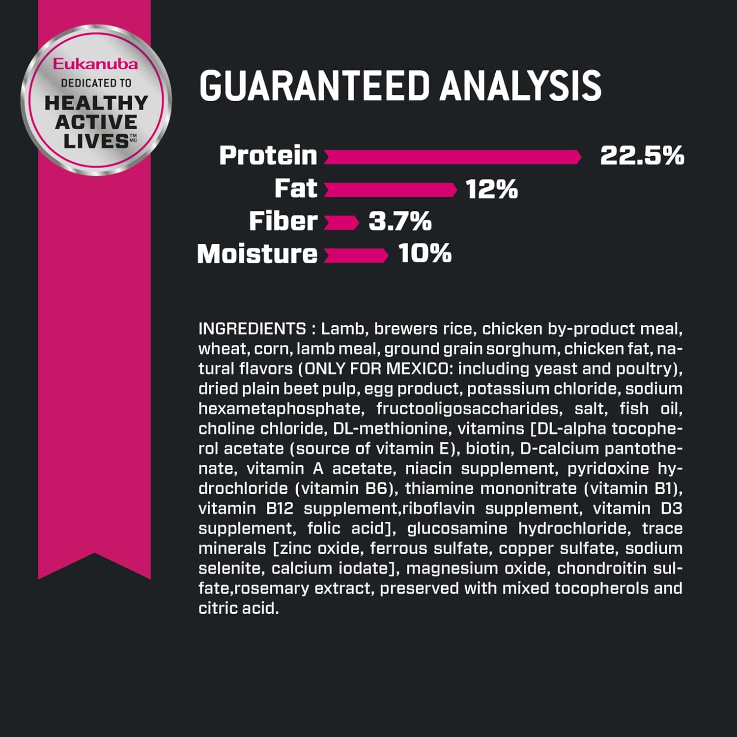 Lamb, Brewers Rice, Chicken By-Product Meal (source of Chondroitin Sulfate and Glucosamine), Corn Meal, Ground Whole Grain Sorghum, Ground Whole Grain Barley, Fish Meal (source of fish oil), Dried Beet Pulp, Natural Flavor, Dried Egg Product, Chicken Fat (preserved with mixed Tocopherols, a source of Vitamin E), Dicalcium Phosphate, Potassium Chloride, Salt, Sodium Hexametaphosphate, Calcium Carbonate, Fructooligosaccharides, Choline Chloride, DL-Methionine, Minerals (Ferrous Sulfate, Zinc Oxide, Manganese Sulfate, Copper Sulfate, Manganous Oxide, Potassium Iodide), Vitamins (Ascorbic Acid, Vitamin A Acetate, Calcium Pantothenate, Biotin, Thiamine Mononitrate, Vitamin B12 Supplement, Niacin, Riboflavin Supplement, Inositol, Pyridoxine Hydrochloride, Vitamin D3 Supplement, Folic Acid), Brewers Dried Yeast, Vitamin E Supplement, L-Carnitine, Beta-Carotene, Rosemary Extract.