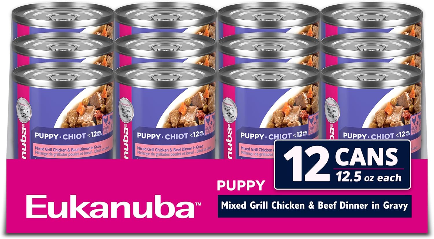 - Contains (12) 12.5-Oz. Cans Of Eukanuba Puppy Mixed Grill With Chicken And Beef In Gravy Canned Dog Food