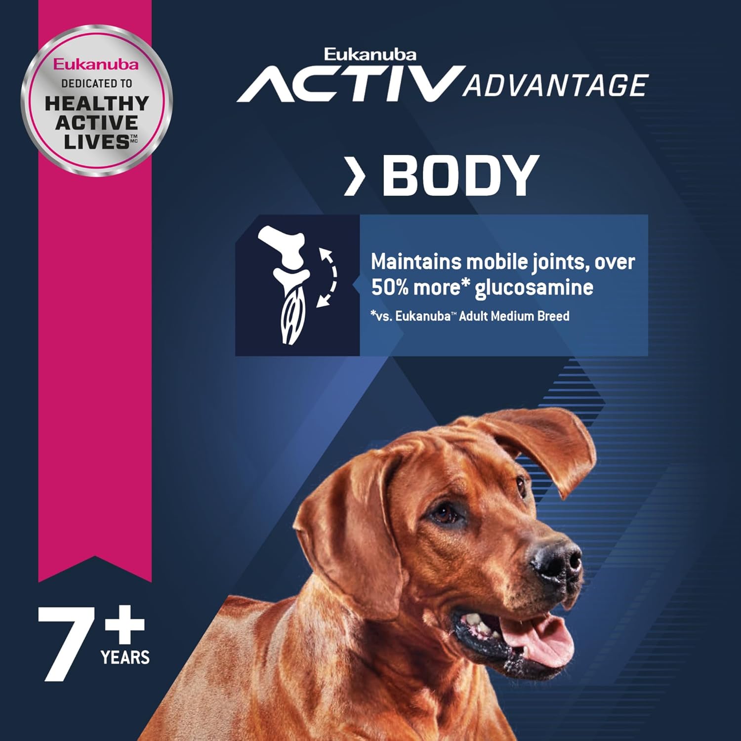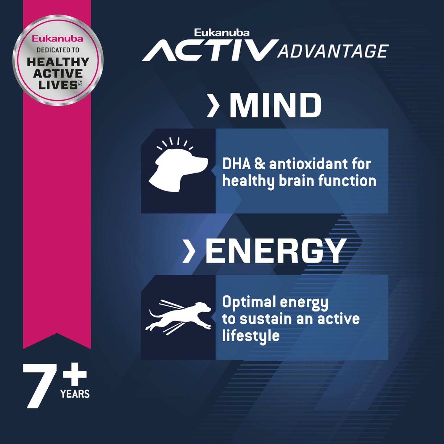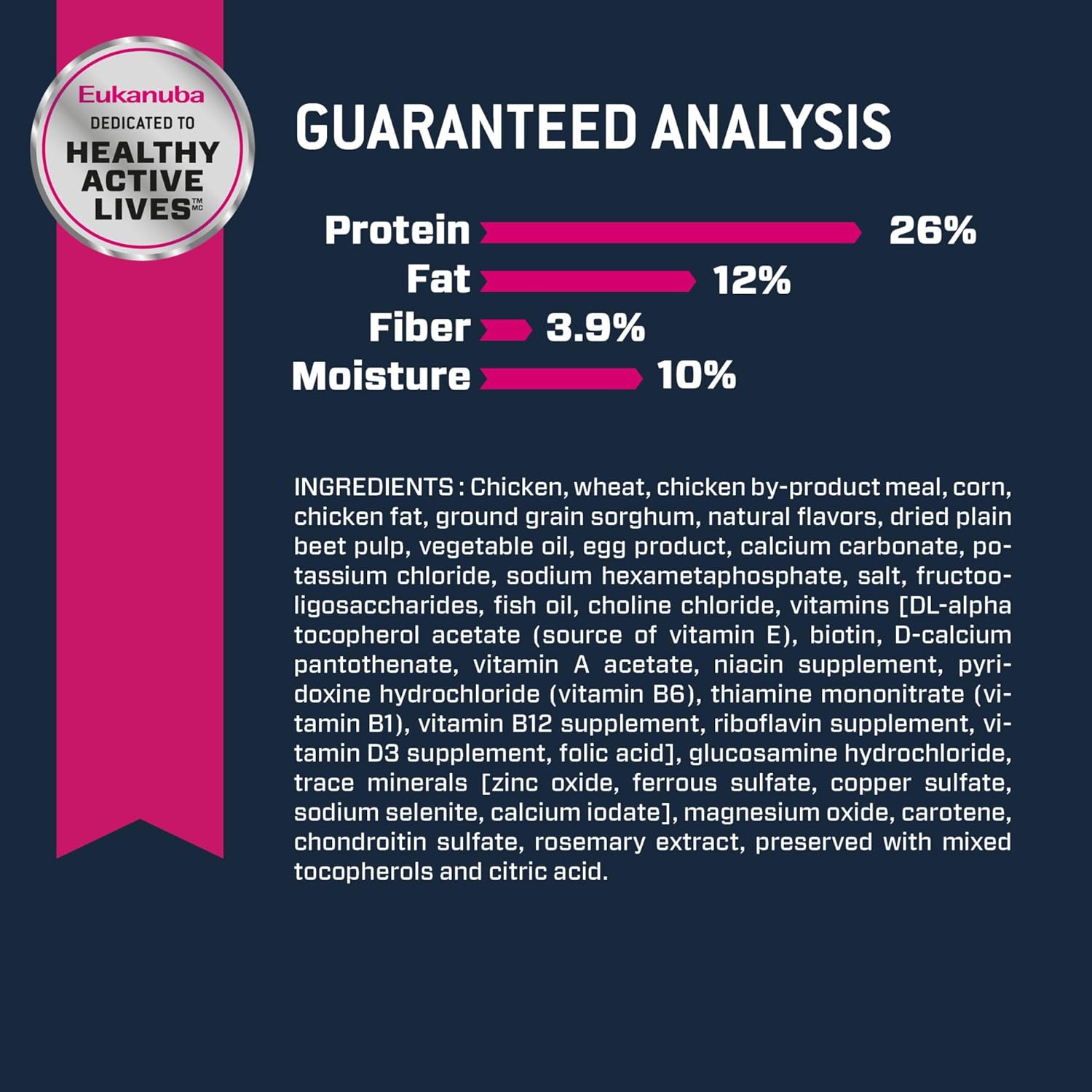 Eukanuba Senior Large Breed Dry Dog Food is specially formulated for senior dogs over 7 years old and weighing more than 55 lbs. With high-quality chicken as the first ingredient, this diet provides complete and balanced nutrition to support your dog’s body, mind, and energy needs. Glucosamine and chondroitin sulfate help keep joints mobile and muscles strong, while DHA and antioxidants support healthy brain function. The formula also includes optimal levels of fats and carbohydrates to fuel active senior dogs, and guaranteed antioxidant levels to help maintain natural defenses. With 3D DentaDefense, it supports dental health by reducing tartar buildup for clean teeth and healthy gums.