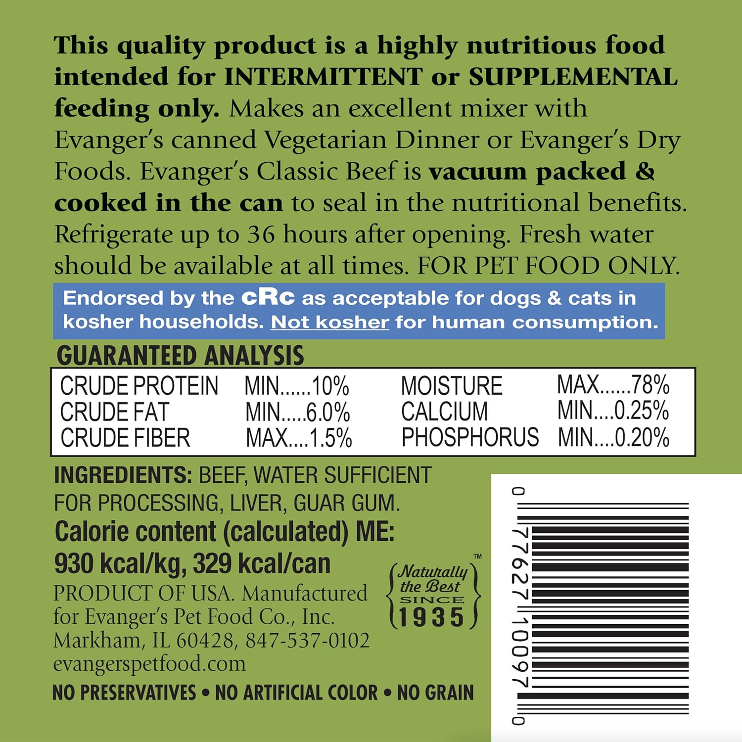 Brand Evanger's Flavor Beef Age Range (Description) All Life Stages Item Form Granule Specific Uses For Product...