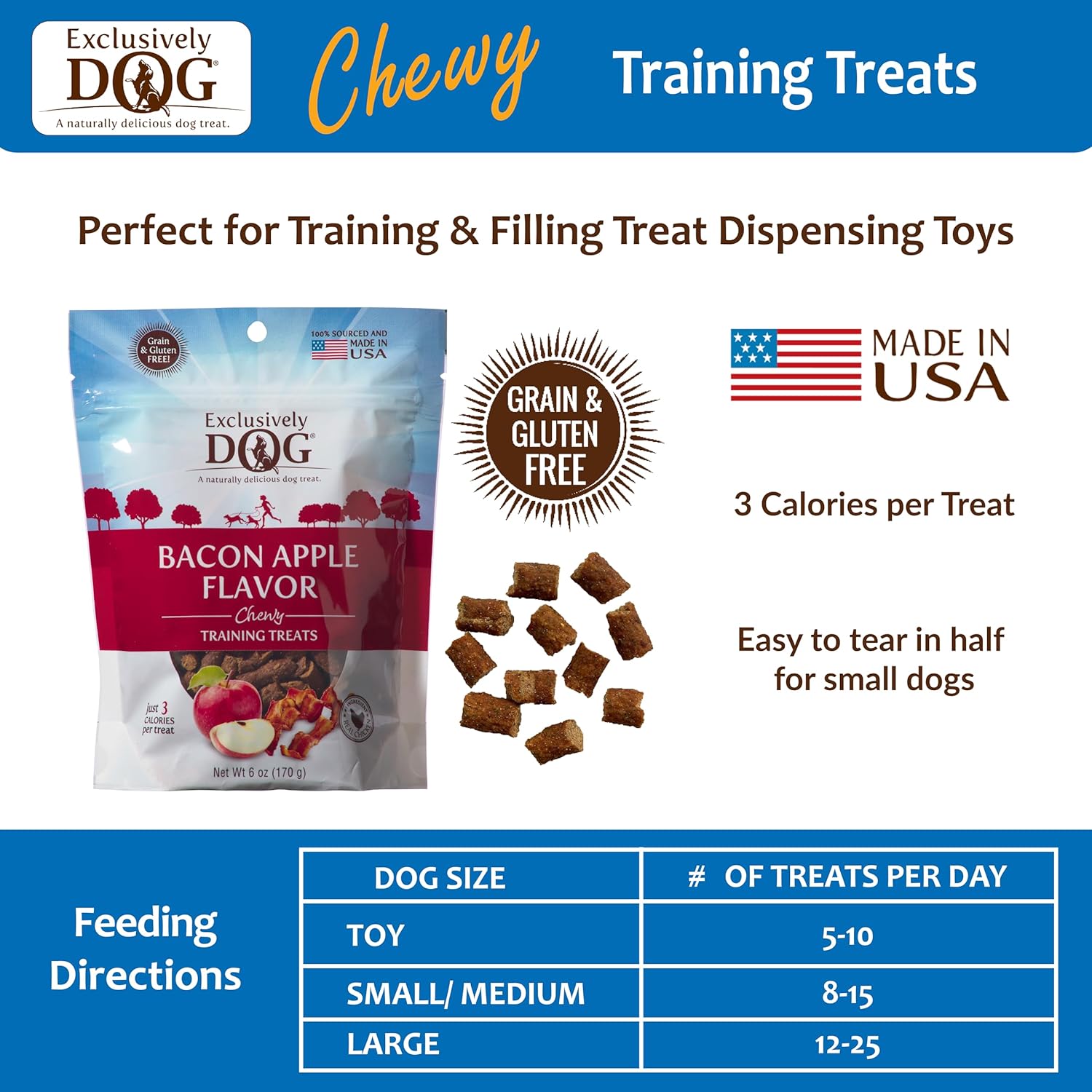 Exclusively Dog Chewy Training Treats Bacon Apple Flavor Grain Free Gluten Free, Made in The USA, 6 oz.