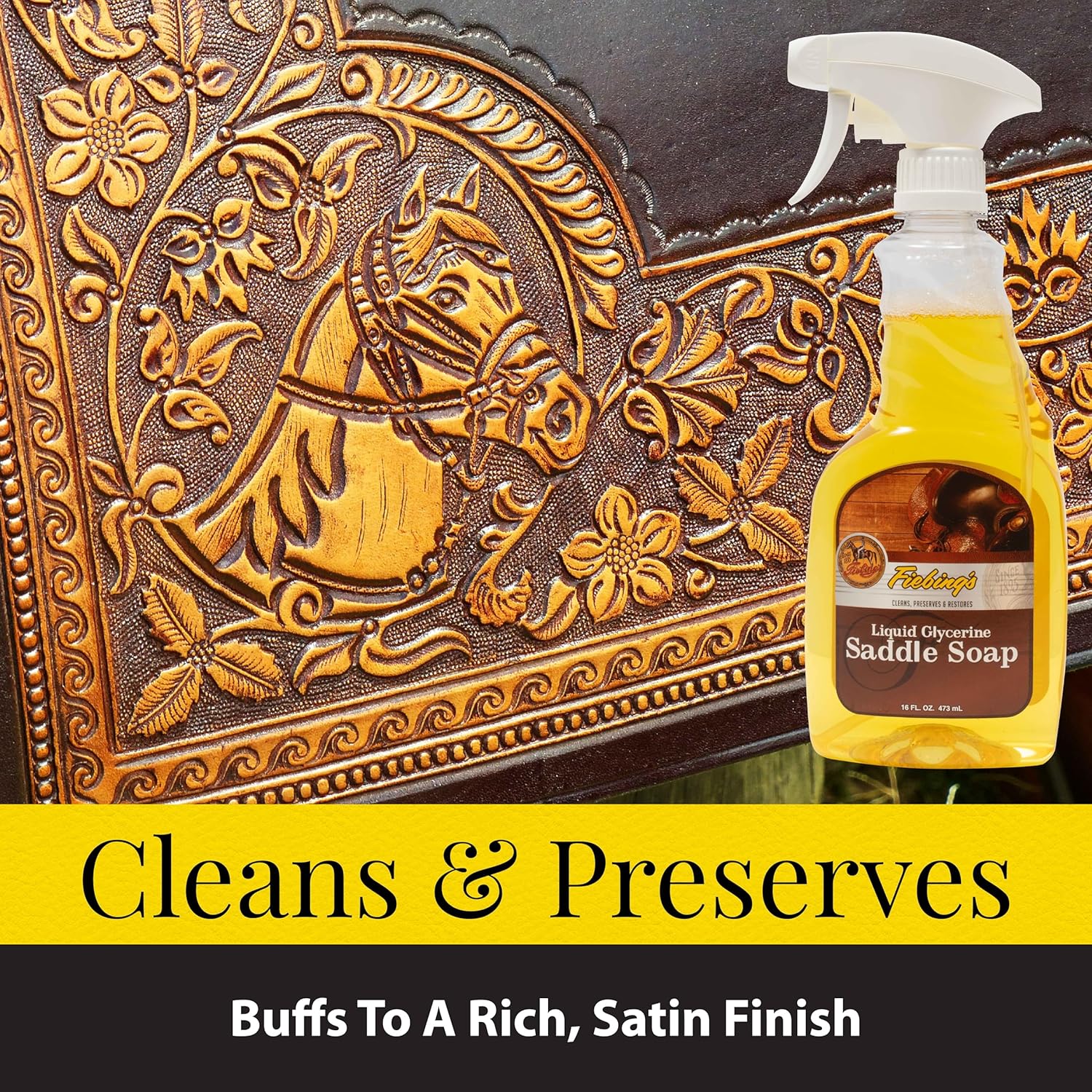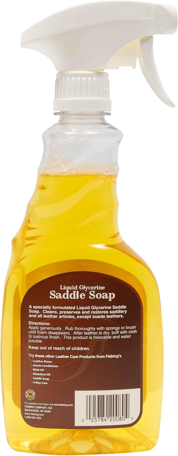 Keep your leather looking its best with Fiebing's Liquid Glycerine Saddle Soap, a trusted cleaner and conditioner since 1895. This convenient spray formula makes leather care quick and easy — just spray on, wipe off, and buff to reveal a rich satin finish. Perfect for saddles, tack, boots, jackets, and even leather upholstery, this multipurpose solution cleans, conditions, and preserves smooth leather to extend its life and beauty.