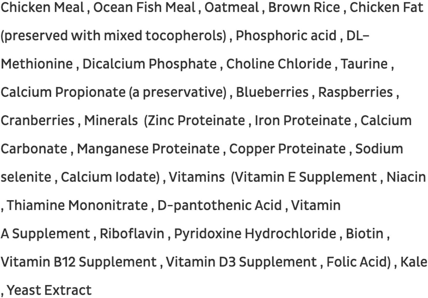 Chicken Meal Ocean Fish Meal Oatmeal Brown Rice Chicken Fat (Mixed Tocopherols) Phosphoric acid DL–Methionine Choline Chloride...