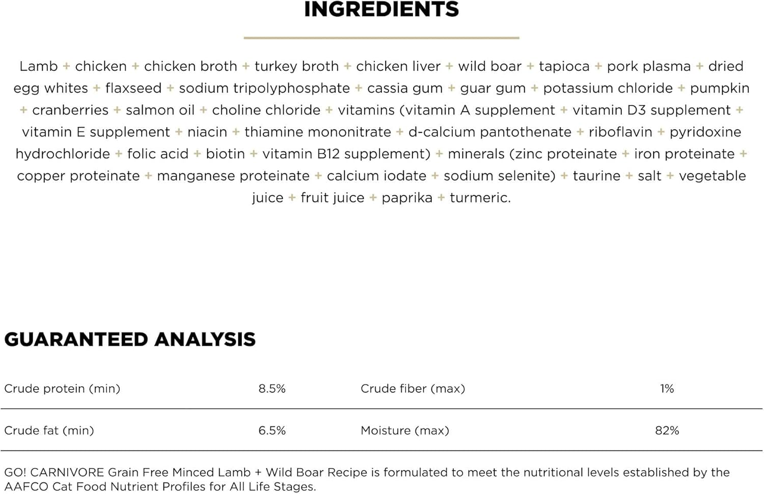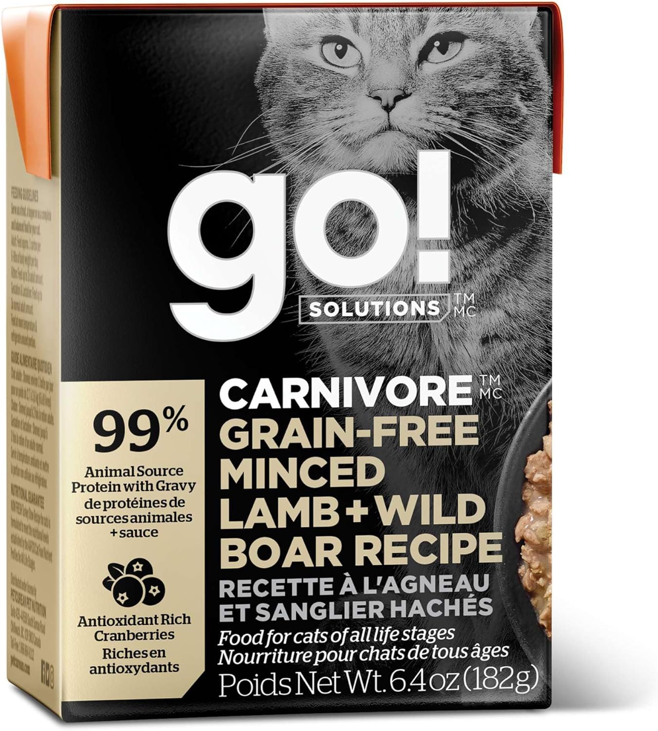 Go! Solutions Carnivore, Grain-Free, Protein Rich Wet Cat Food, Minced Lamb and Wild Boar Recipe, 6.4 oz