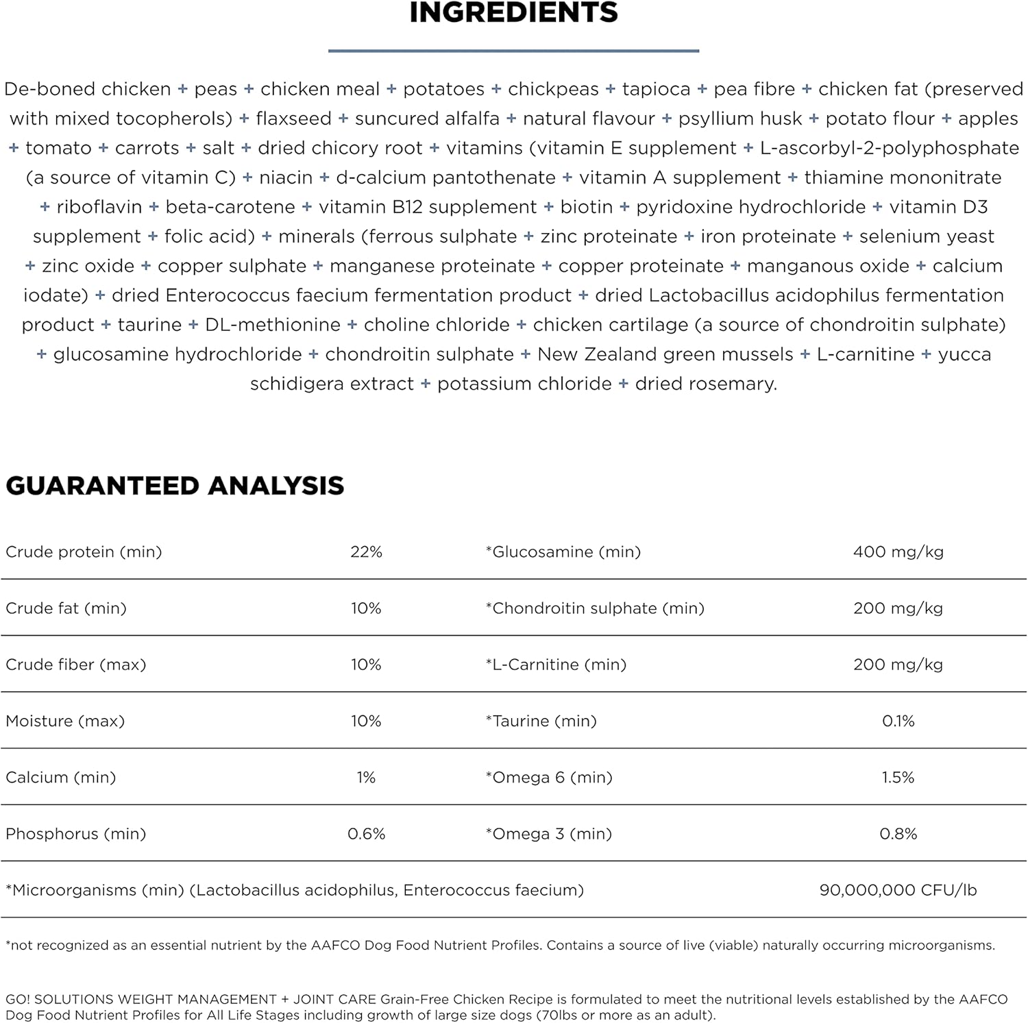 Go! Solutions Weight Management + Joint Care, Grain-Free Dry Dog Food, Chicken Adult and Senior Recipe