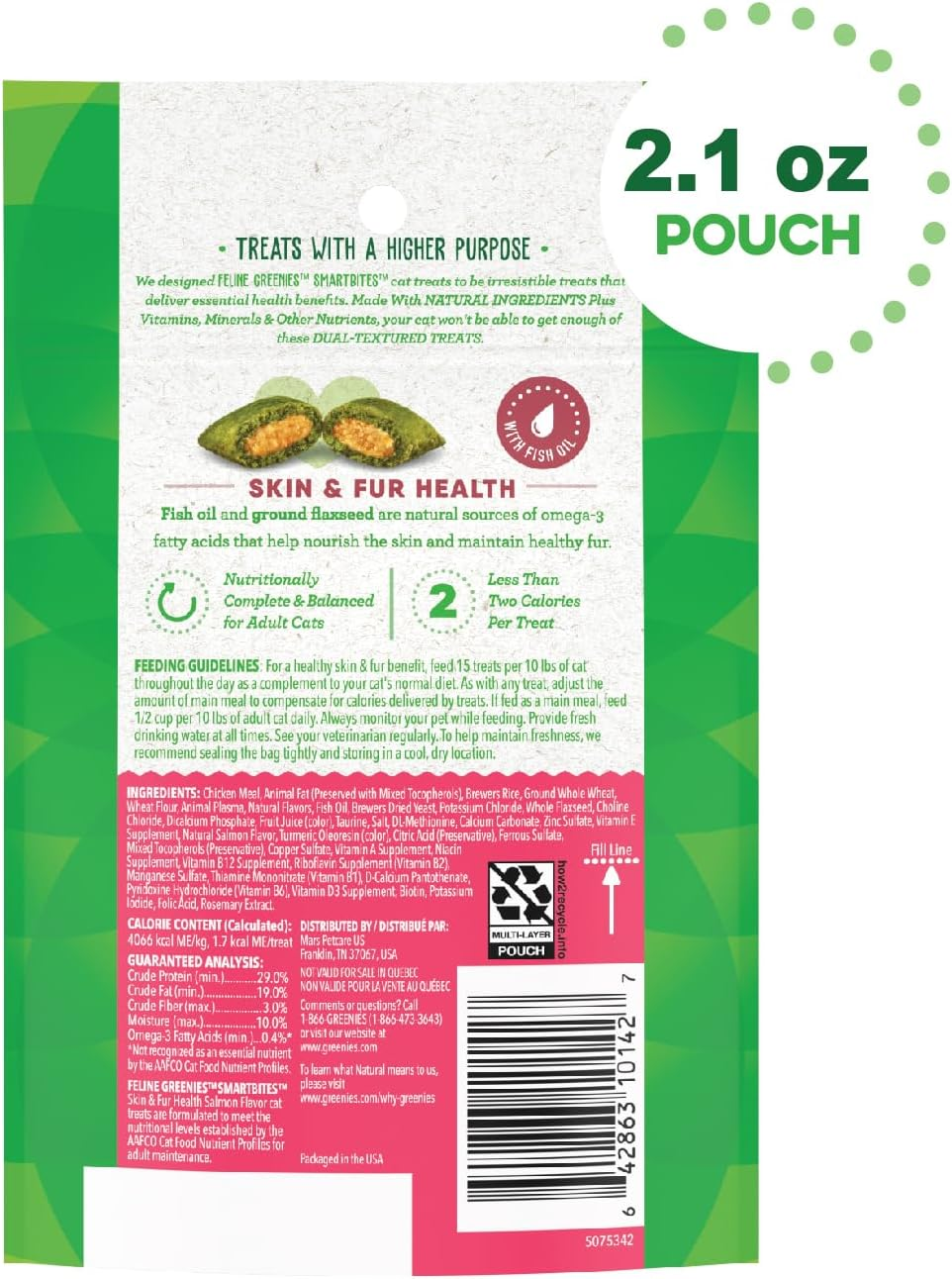 Greenies Feline Smartbites Skin & Fur Crunchy and Soft Natural Cat Treats, Salmon Flavor