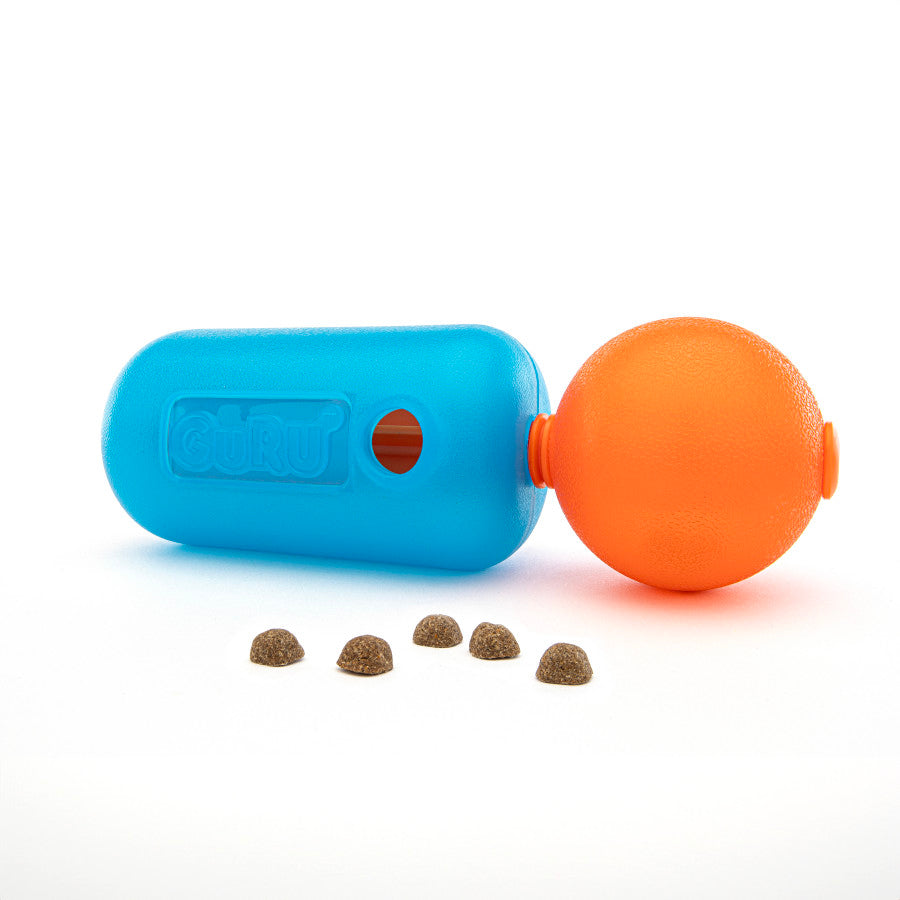The Treat Challenger, one of GURU’s most innovative designs, is ideal for occupying dogs for long periods of time while challenging and engaging instinctive behaviors. This one toy brings twice the challenge! Hand load kibble or small treats into the ball and cylinder, and as the toy moves around, it dispenses kibble finally reaching - and rewarding - the dog. This toy uniquely has two different levels of difficulty to keep dogs engaged for long periods of time. The Treat Challenger is made with Chew Pro, GURU’s ultra-durable, custom, non-toxic thermoplastic rubber formulated specifically for tough chew sessions and long-lasting play. Easy to clean and top-shelf dishwasher safe.