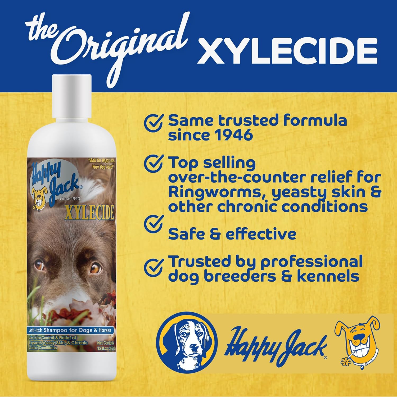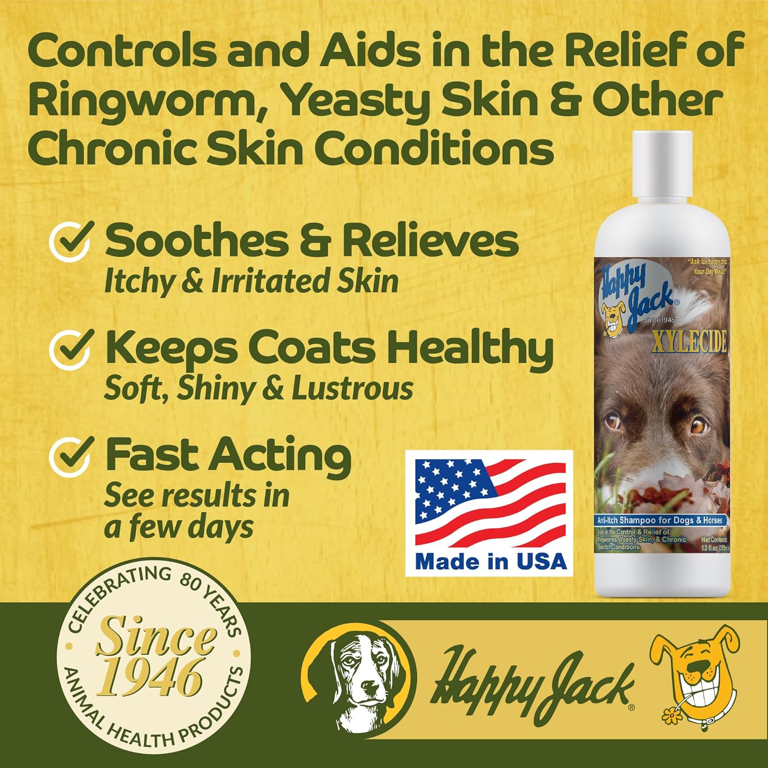 Happy Jack® Xylecide Shampoo contains 2.0% Chloroxylenol, a powerful anti-fungal, anti-bacterial, and anti-microbial agent. It is formulated to treat ringworms, hot spots, seborrheic dermatitis, dandruff, psoriasis, eczema, kennel itch, and other chronic skin issues in dogs and horses.