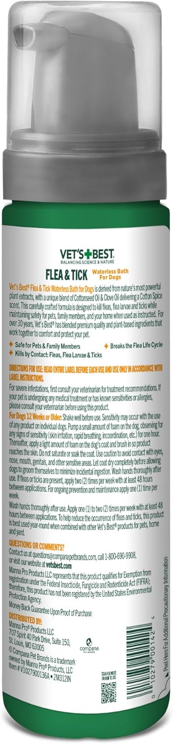 - FLEA & TICK WATERLESS BATH FOR DOGS – Fight fleas with ease. Just gently apply foam to your dog’s coat.