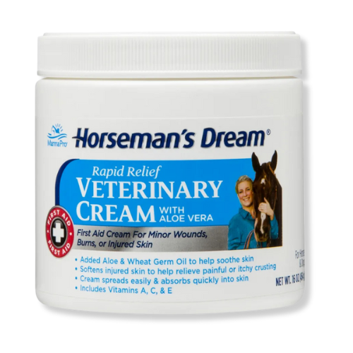 Horsemans Dream Veterinary Cream is a powerful first-aid solution for a variety of minor skin injuries in horses, including cuts, scrapes, burns, and sunburns. Its aloe-based formula absorbs quickly to provide rapid relief while promoting natural healing.