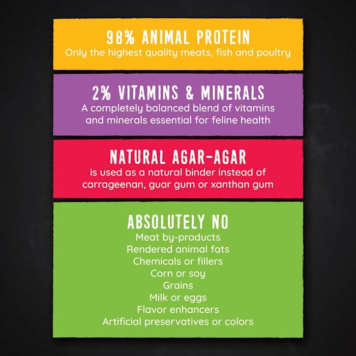 Irresistible aroma, texture and flavor WITHOUT guar gum or carrageenan INGREDIENTS: Beef, Beef Broth, Agar-Agar, Tricalcium Phosphate, Potassium Chloride, Choline Chloride, Salmon Oil, Taurine, Salt, Iron Proteinate, Iron Proteinate Zinc, Mangan Proteinate, Magnesium Proteinate, Calcium Selenite, Thiamine Mononitrate, Niacin Supplement, Vitamin E Supplement, Calcium Pantothenate, Pyridoxine Hydrochloride, Riboflavin Supplement, Biotin, Vitamin A Supplement, Vitamin B12 Supplement, vitamin D3 supplement, folic acid