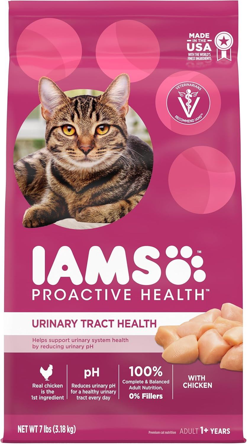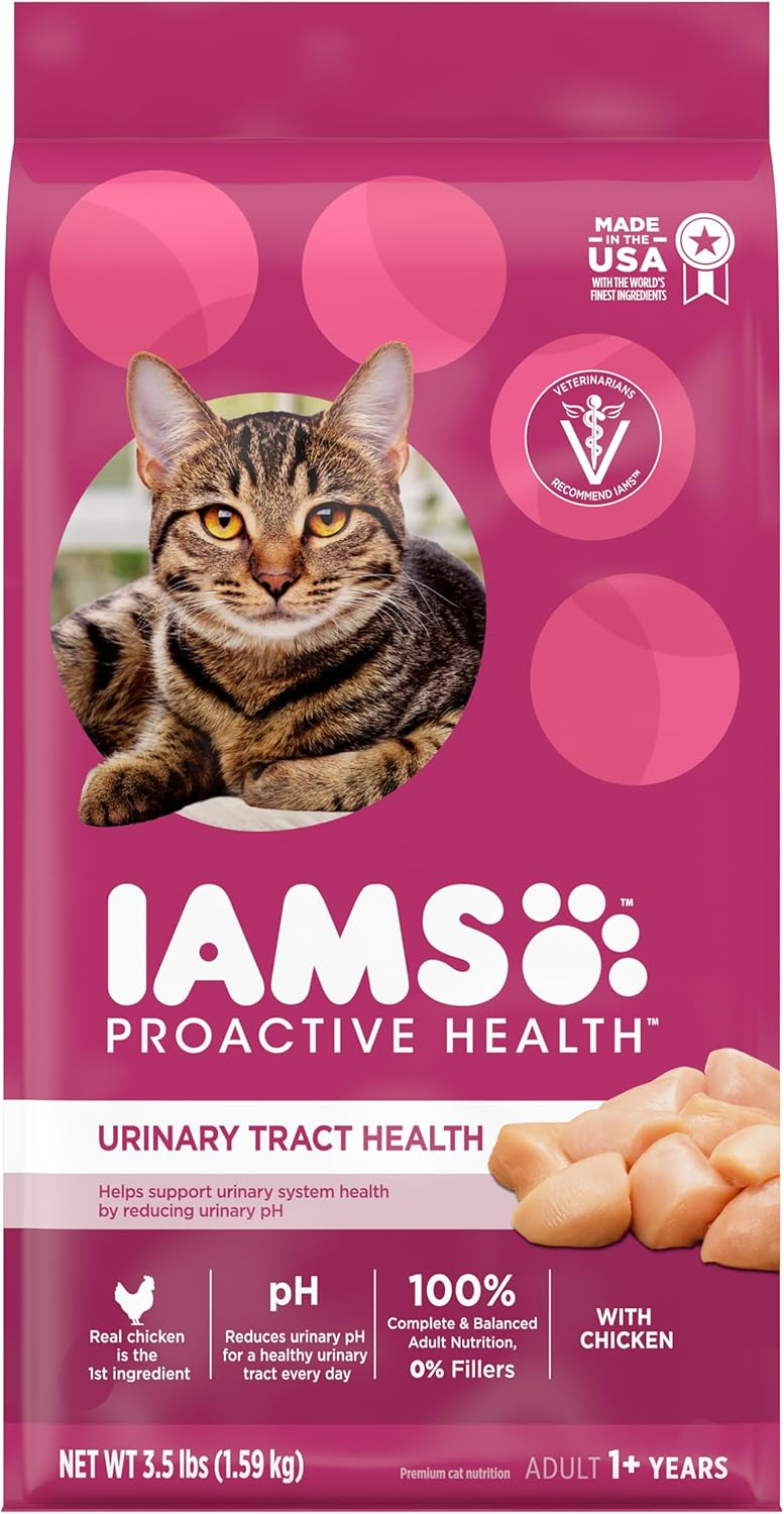IAMS knows that each cat is different. That??s why our range of recipes has been specifically tailored to your cat??s needs and life stages. Keep your cats at their best with IAMS PROACTIVE HEALTH Adult Urinary Tract Health Dry Cat Food with Chicken. Perfect for outdoor or indoor cats, this formula helps reduce the pH in cat urine to promote urinary tract health. Chicken is the #1 ingredient in this protein-rich cat kibble formula. Plus, it includes vitamin E to maintain a healthy feline immune system, as well as essential nutrients, like calcium and potassium, for a healthy heart. The kibble has an optimal omega-6 and -3 fatty acid ratio for a soft, shiny coat, and the crunchy texture helps reduce plaque buildup. So, if you??re looking for a dry food for urinary tract health, get your paws on this?? and keep your feline happy, healthy, and ready to pounce with IAMS.