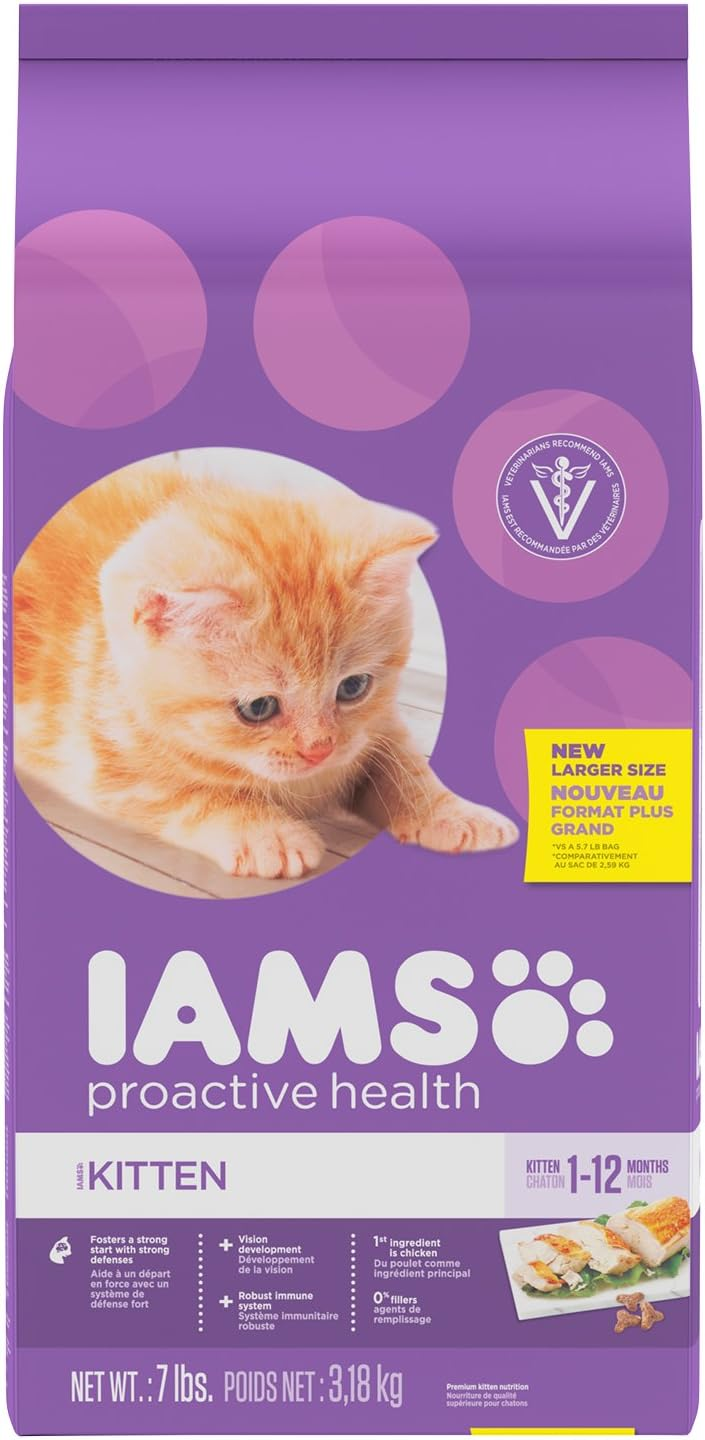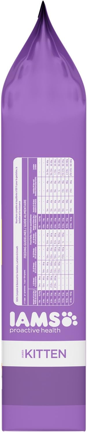 Give your kitten the same wholesome nutrition as mother's milk with IAMS PROACTIVE HEALTH Kitten (1 Year Old and Younger) Chicken Recipe Dry Cat Food. This wholesome cat food formula ƒ??ƒ?? designed specifically for growing kittens ƒ??ƒ?? is made with chicken as the first ingredient and contains 0% fillers. IAMS Food for Kittens also features omega-3 DHA for brain development, taurine for vision and eye health and antioxidants to support a healthy immune system. Best of all, our tailored fiber blend with prebiotics and beet pulp supports healthy digestion and helps maximize nutrient absorption, so you know your little one's favorite hearty cat food is helping them grow into happy, healthy adult cats. Help your kitten grow big and strong with IAMS PROACTIVE HEALTH Kitten Formula Dry Food for Cats.