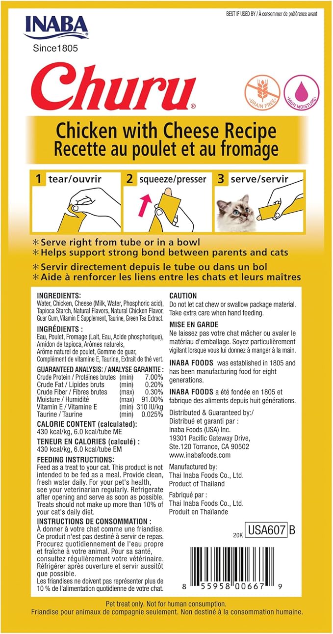 INABA Churu Cat Treats, Grain-Free, Lickable, Squeezable Creamy Purée Cat Treat/Topper with Vitamin E & Taurine, 0.5 Ounces Each Tube, 24 Tubes (4 per Pack), Chicken Recipe (Copy)