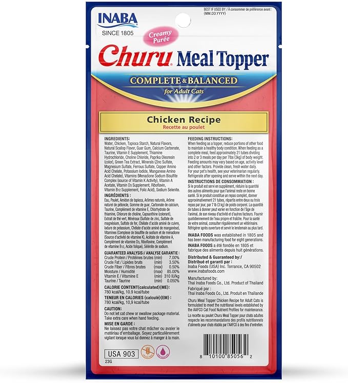 INABA Churu Meal Topper for Cats, Complete & Balanced, Creamy, Lickable Purée Cat Food Topper, 0.5 Ounce Tube, 24 Tubes (4 per Pack), Chicken Recipe