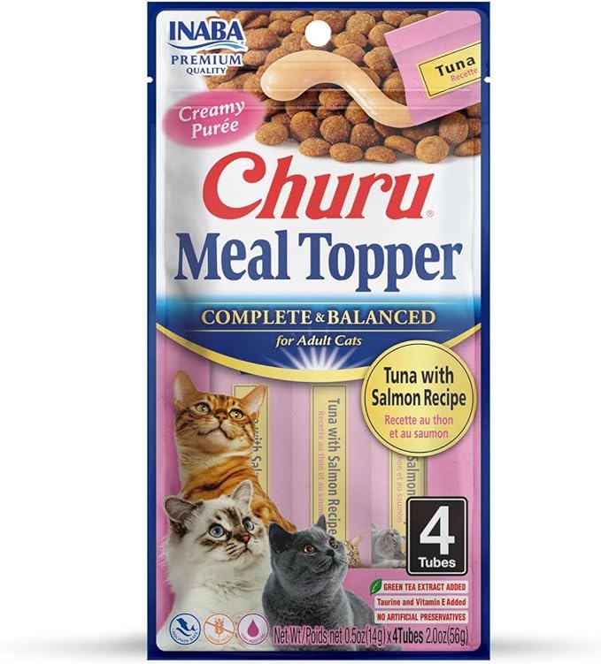 INABA Churu Meal Topper for Cats, Complete & Balanced, Creamy, Lickable Purée Cat Food Topper, 0.5 Ounce Tube, 4 Tubes (4 per Pack), Tuna with Salmon Recipe