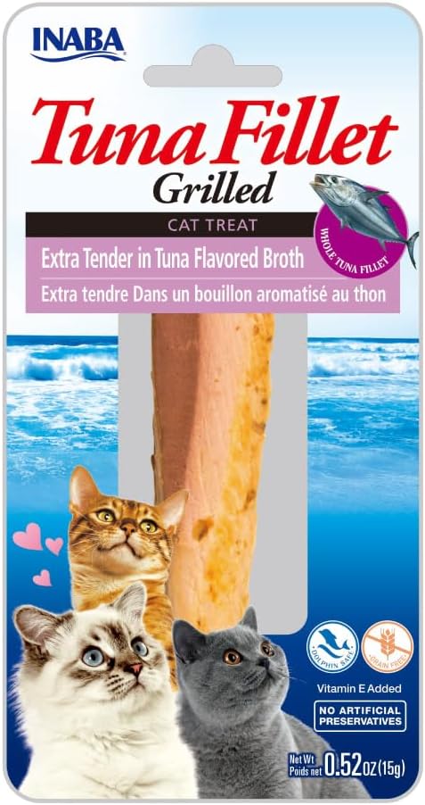 INABA Premium Hand-Cut Grilled Tuna Fillet Cat Treats/Topper with Vitamin E and Green Tea Extract, 0.52 Ounces Each, Pack of 6, Extra Tender Tuna Broth