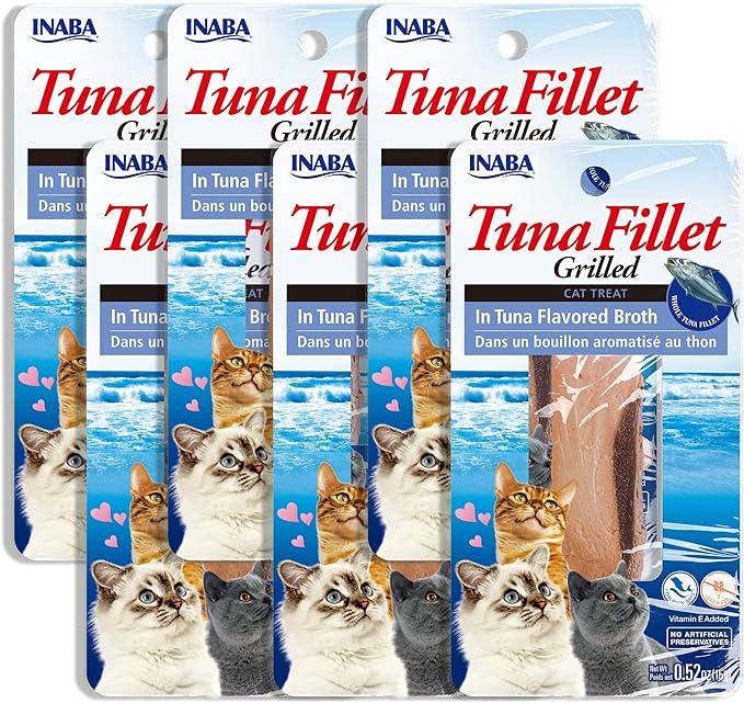 INABA Premium Hand-Cut Grilled Tuna Fillet Cat Treats/Topper with Vitamin E and Green Tea Extract, 0.52 Ounces Each, Pack of 6, Tuna Broth