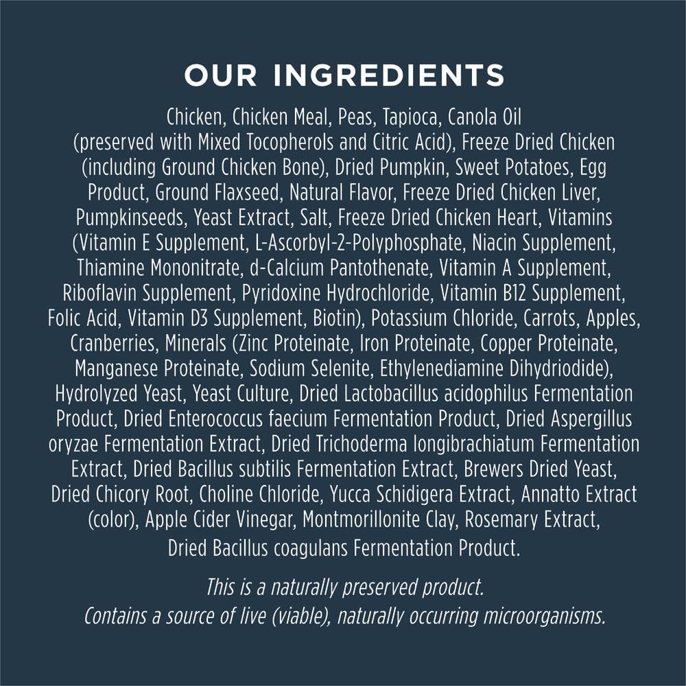 Chicken, Chicken Meal, Peas, Tapioca, Canola Oil (preserved with Mixed Tocopherols and Citric Acid), Freeze Dried Chicken (including Ground Chicken Bone), Dried Pumpkin, Sweet Potatoes, Egg Product, Ground Flaxseed, Natural Flavor, Freeze Dried Chicken Liver, Pumpkinseeds, Yeast extract, Salt, Freeze Dried Chicken Heart, Vitamins (Vitamin E Supplement, L-Ascorbyl-2-Polyphosphate, Niacin Supplement, Thiamine Mononitrate, d-Calcium Pantothenate, Vitamin A Supplement, Riboflavin Supplement, Pyridoxine Hydrochloride, Vitamin B12 Supplement, Folic Acid, Vitamin D3 Supplement, Biotin), Potassium Chloride, Carrots, Apples, Cranberries, Minerals (Zinc Proteinate, Iron Proteinate, Copper Proteinate, Manganese Proteinate, Sodium Selenite, Ethylenediamine Dihydriodide), Hydrolyzed Yeast, Yeast Culture, Dried Lactobacillus acidophilus Fermentation Product, Dried Enterococcus faecium Fermentation Product, Dried Aspergillus oryzae Fermentation Extract, Dried Trichoderma longibrachiatum Fermentation Extract, Dried Bacillus subtilis Fermentation Extract, Brewers Dried Yeast, Dried Chicory Root, Choline Chloride, Yucca Schidigera Extract, Annatto Extract (color), Apple Cider Vinegar, Montmorillonite Clay, Rosemary Extract, Dried Bacillus coagulans Fermentation Product.