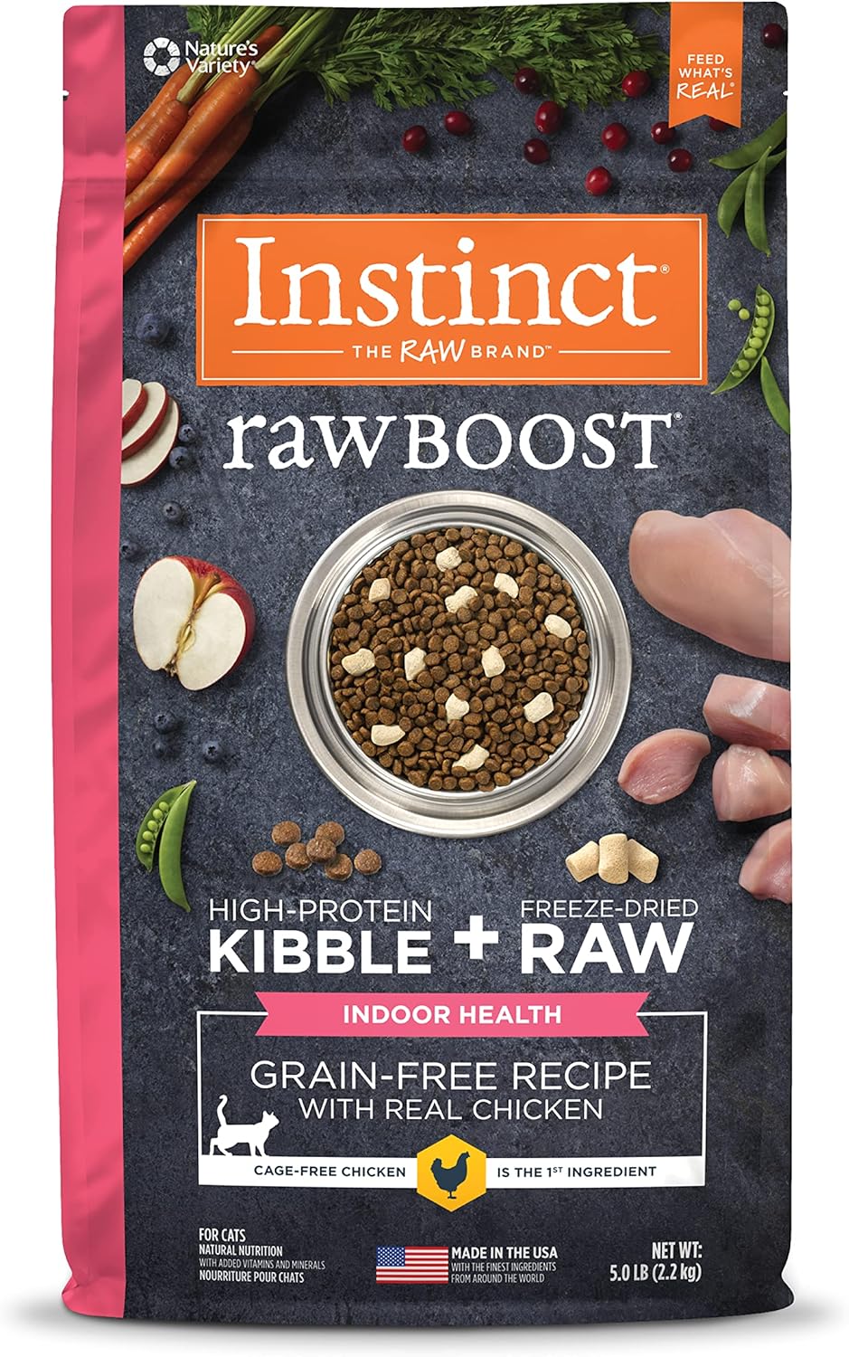 - GRAIN FREE INDOOR CAT FOOD WITH FREEZE DRIED RAW CAGE FREE CHICKEN: Instinct Raw Boost dry cat food combines high protein, grain free kibble with all natural bites of freeze dried raw chicken. Cage free chicken is the #1 ingredient.