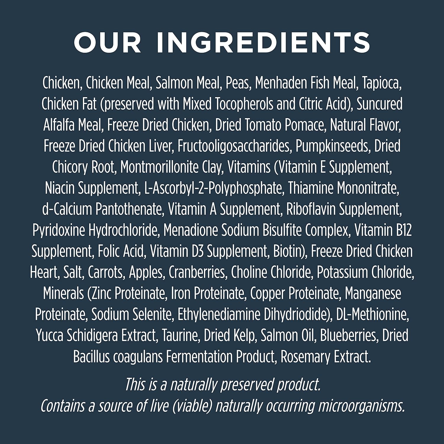 Chicken, Chicken Meal, Salmon Meal, Peas, Menhaden Fish Meal, Tapioca, Chicken Fat (preserved with Mixed Tocopherols and Citric Acid), Suncured Alfalfa Meal, Freeze Dried Chicken, Dried Tomato Pomace, Natural Flavor, Freeze Dried Chicken Liver, Fructooligosaccharides, Pumpkinseeds, Dried Chicory Root, Montmorillonite Clay, Vitamins (Vitamin E Supplement, Niacin Supplement, L-Ascorbyl-2-Polyphosphate, Thiamine Mononitrate, d-Calcium Pantothenate, Vitamin A Supplement, Riboflavin Supplement, Pyridoxine Hydrochloride, Menadione Sodium Bisulfite Complex, Vitamin B12 Supplement, Folic Acid, Vitamin D3 Supplement, Biotin), Freeze Dried Chicken Heart, Salt, Carrots, Apples, Cranberries, Choline Chloride, Potassium Chloride, Minerals (Zinc Proteinate, Iron Proteinate, Copper Proteinate, Manganese Proteinate, Sodium Selenite, Ethylenediamine Dihydriodide), DL-Methionine, Yucca Schidigera Extract, Taurine, Dried Kelp, Salmon Oil, Blueberries, Dried Bacillus coagulans Fermentation Product, Rosemary Extract.