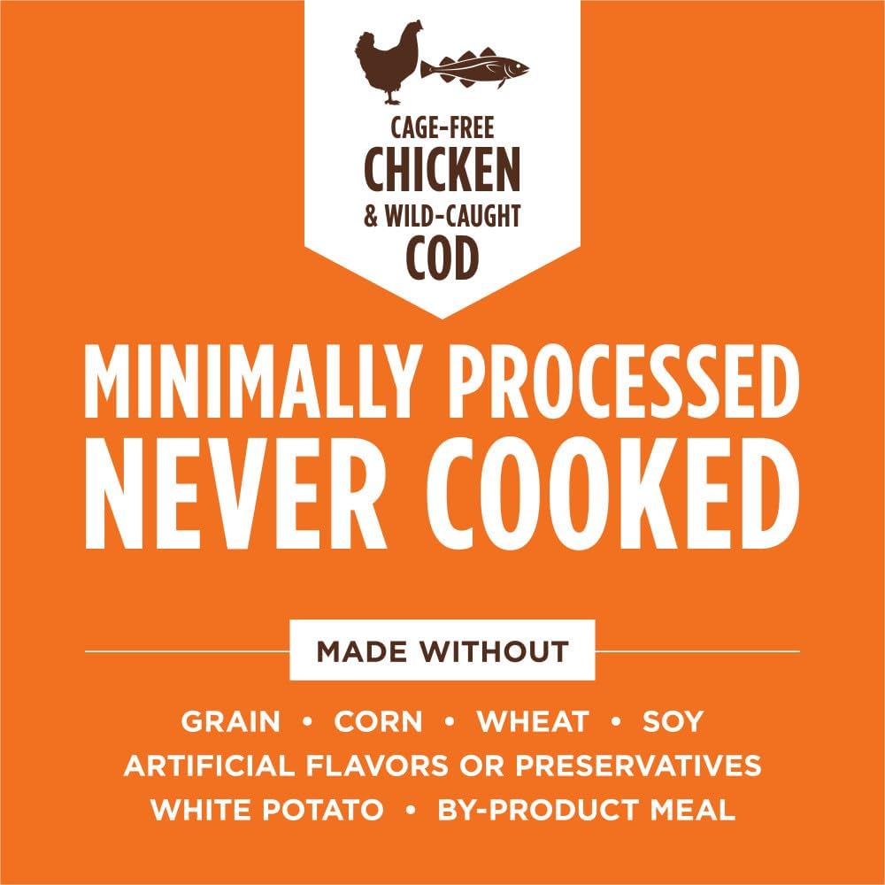 Chicken (including Ground Chicken Bone), Chicken Liver, Pumpkinseeds, Chicken Heart, Cod, Ground Flaxseed, Beet Juice (color), Salmon Oil, Ground Chia Seed, Cranberries, Dried Kelp, Mixed Tocopherols (for freshness), Rosemary Extract