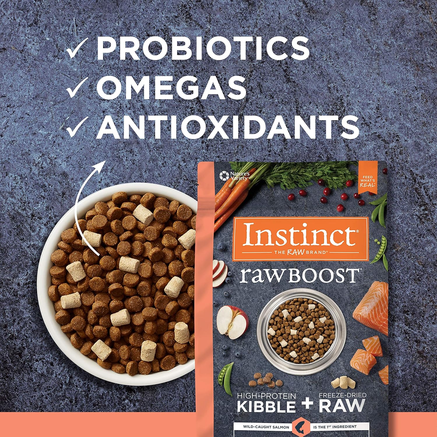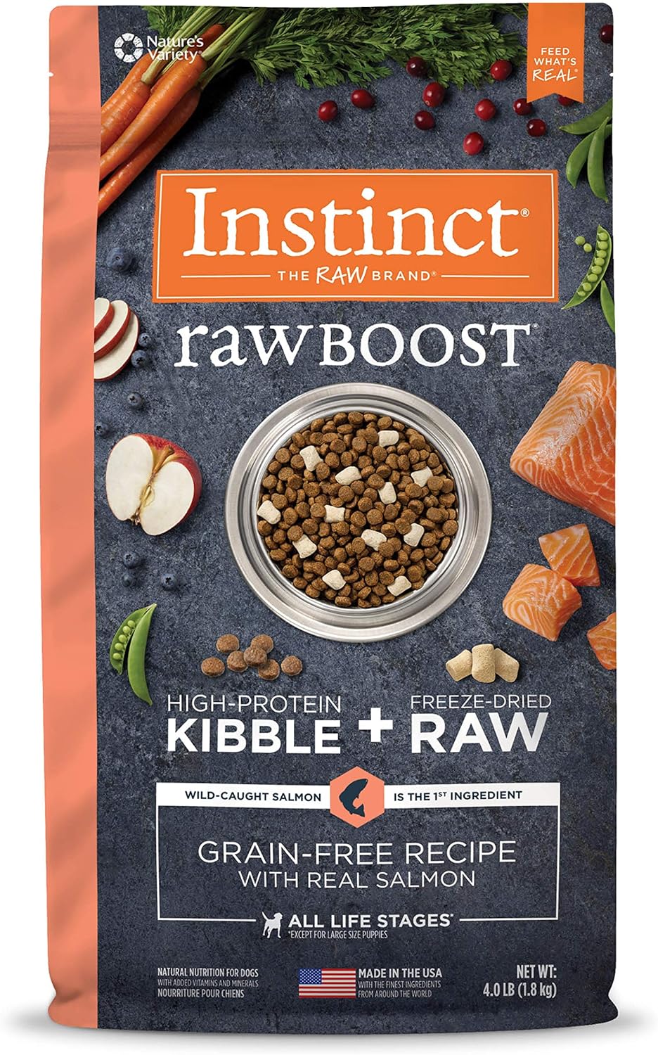 - GRAIN FREE DOG FOOD WITH FREEZE DRIED RAW: Instinct Raw Boost natural dry dog food combines high protein, grain free salmon kibble with all natural bites of freeze dried raw USA Raised beef. Wild caught salmon is the #1 ingredient. Poultry free recipe.