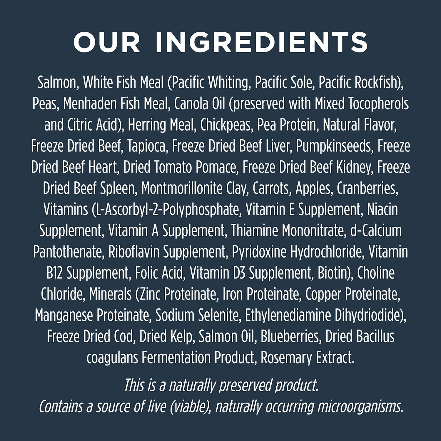 Salmon, White Fish Meal (Pacific Whiting, Pacific Sole, Pacific Rockfish), Peas, Menhaden Fish Meal, Canola Oil (preserved with Mixed Tocopherols and Citric Acid), Herring Meal, Chickpeas, Pea Protein, Natural Flavor, Freeze Dried Beef, Tapioca, Freeze Dried Beef Liver, Pumpkinseeds, Freeze Dried Beef Heart, Dried Tomato Pomace, Freeze Dried Beef Kidney, Freeze Dried Beef Spleen, Montmorillonite Clay, Carrots, Apples, Cranberries, Vitamins (L-Ascorbyl-2-Polyphosphate, Vitamin E Supplement, Niacin Supplement, Vitamin A Supplement, Thiamine Mononitrate, d-Calcium Pantothenate, Riboflavin Supplement, Pyridoxine Hydrochloride, Vitamin B12 Supplement, Folic Acid, Vitamin D3 Supplement, Biotin), Choline Chloride, Minerals (Zinc Proteinate, Iron Proteinate, Copper Proteinate, Manganese Proteinate, Sodium Selenite, Ethylenediamine Dihydriodide), Freeze Dried Cod, Dried Kelp, Salmon Oil, Blueberries, Dried Bacillus coagulans Fermentation Product, Rosemary Extract