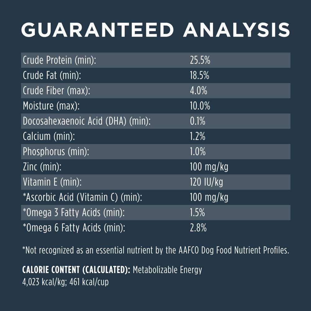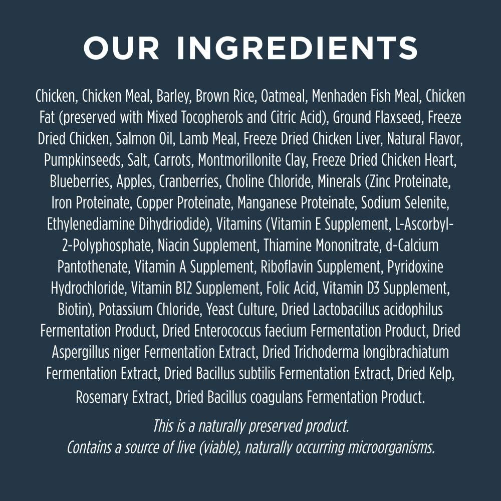 Chicken, Chicken Meal, Barley, Brown Rice, Oatmeal, Menhaden Fish Meal, Chicken Fat (preserved with Mixed Tocopherols and Citric Acid), Ground Flaxseed, Freeze Dried Chicken, Salmon Oil, Lamb Meal, Freeze Dried Chicken Liver, Natural Flavor, Pumpkinseeds, Salt, Carrots, Montmorillonite Clay, Freeze Dried Chicken Heart, Blueberries, Apples, Cranberries, Choline Chloride, Minerals (Zinc Proteinate, Iron Proteinate, Copper Proteinate, Manganese Proteinate, Sodium Selenite, Ethylenediamine Dihydriodide), Vitamins (Vitamin E Supplement, L-Ascorbyl-2-Polyphosphate, Niacin Supplement, Thiamine Mononitrate, d-Calcium Pantothenate, Vitamin A Supplement, Riboflavin Supplement, Pyridoxine Hydrochloride, Vitamin B12 Supplement, Folic Acid, Vitamin D3 Supplement, Biotin), Potassium Chloride, Yeast Culture, Dried Lactobacillus acidophilus Fermentation Product, Dried Enterococcus faecium Fermentation Product, Dried Aspergillus niger Fermentation Extract, Dried Trichoderma longibrachiatum Fermentation Extract, Dried Bacillus subtilis Fermentation Extract, Dried Kelp, Rosemary Extract, Dried Bacillus coagulans Fermentation Product.