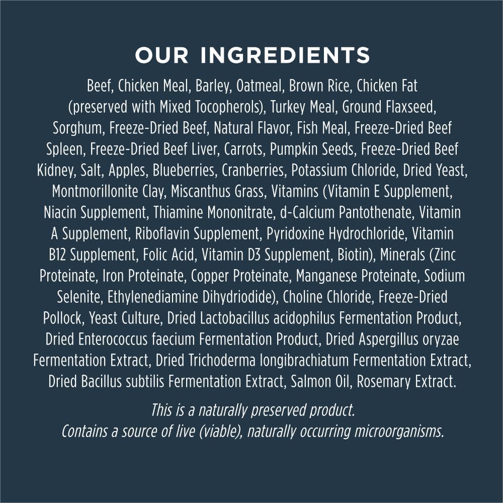 Beef, Chicken Meal, Barley, Oatmeal, Brown Rice, Chicken Fat (preserved with Mixed Tocopherols), Turkey Meal, Ground Flaxseed, Sorghum, Freeze-Dried Beef, Natural Flavor, Fish Meal, Freeze-Dried Beef Spleen, Freeze-Dried Beef Liver, Carrots, Pumpkin Seeds, Freeze-Dried Beef Kidney, Salt, Apples, Blueberries, Cranberries, Potassium Chloride, Dried Yeast, Montmorillonite Clay, Miscanthus Grass, Vitamins (Vitamin E Supplement, Niacin Supplement, Thiamine Mononitrate, d-Calcium Pantothenate, Vitamin A Supplement, Riboflavin Supplement, Pyridoxine Hydrochloride, Vitamin B12 Supplement, Folic Acid, Vitamin D3 Supplement, Biotin), Minerals (Zinc Proteinate, Iron Proteinate, Copper Proteinate, Manganese Proteinate, Sodium Selenite, Ethylenediamine Dihydriodide), Choline Chloride, Freeze-Dried Pollock, Yeast Culture, Dried Lactobacillus acidophilus Fermentation Product, Dried Enterococcus faecium Fermentation Product, Dried Aspergillus oryzae Fermentation Extract, Dried Trichoderma longibrachiatum Fermentation Extract, Dried Bacillus subtilis Fermentation Extract, Salmon Oil, Rosemary Extract.
