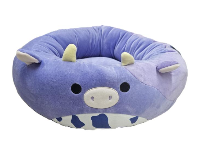 This round Squishmallows Bubba the Cow bolster pet bed is perfect for cuddly cats and dogs alike. Cushioned bolsters around the edges create a natural headrest and include cute Squishmallows design details. The sleeping area is stuffed with polyester fiber filling and a unique squishy fabrication covering the outside. Authentic Squishmallows pet beds are easy to maintain spot clean only. These loveable and snuggable Squishmallows pet beds are the softest and cutest pet beds around. MUST-HAVE Bring the fun home with Original Squishmallows pet beds, made with ultrasoft, high-quality materials. UNIQUE PERSONALITIES Squishmallows pet beds come in a variety of classic Squishmallows styles.