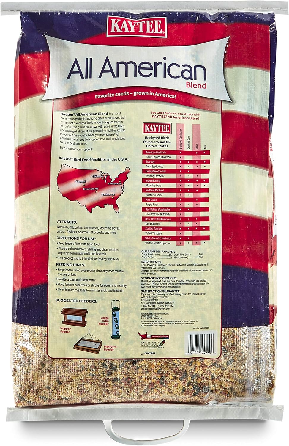 Kaytee All American Blend is a mix of bird-preferred grains, grown and packed with pride in the USA. If you're looking to make your feeder a draw for wild birds, begin by adding Kaytee All American Blend to it. This delicious and nutritious blend is a favorite of a variety of wild birds, and with good reason. It includes a mix of ingredients birds in the wild love and respond to, including black oil sunflower.