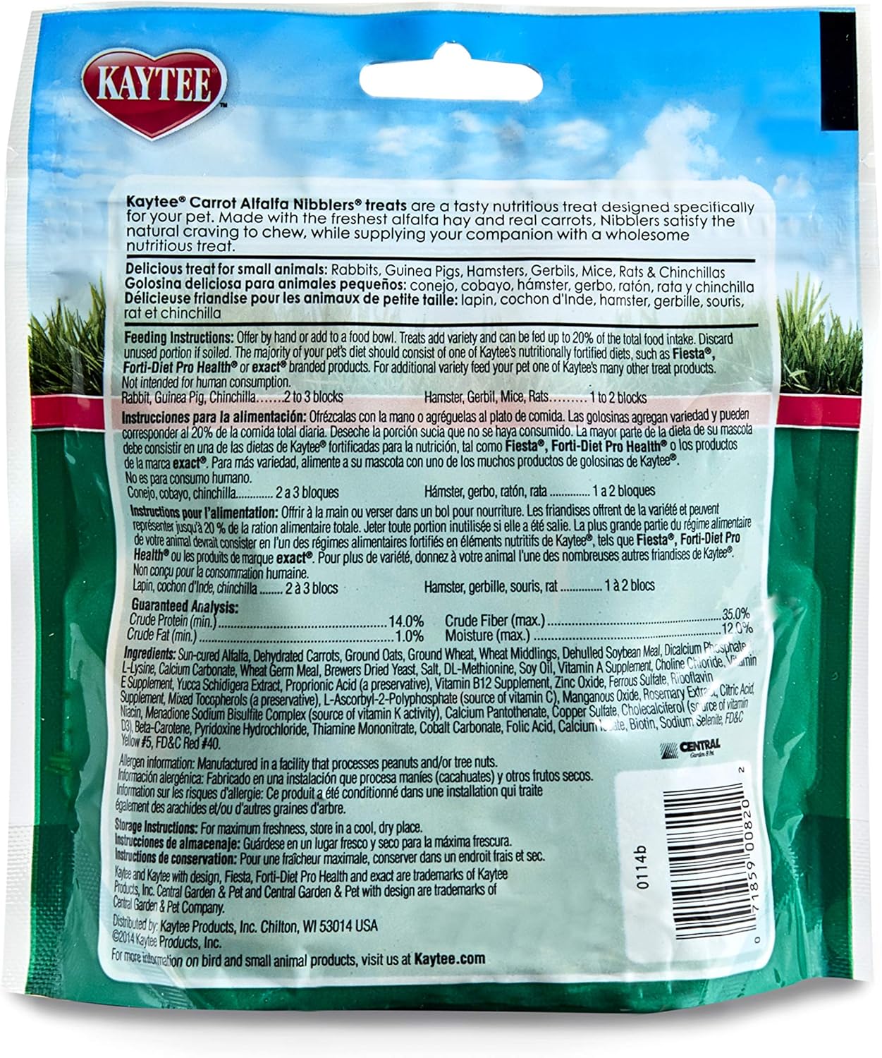 Kaytee Carrot Nibblers are a tasty nutritious treat designed specifically for your pet and are made with the freshest alfalfa hay and real carrots.