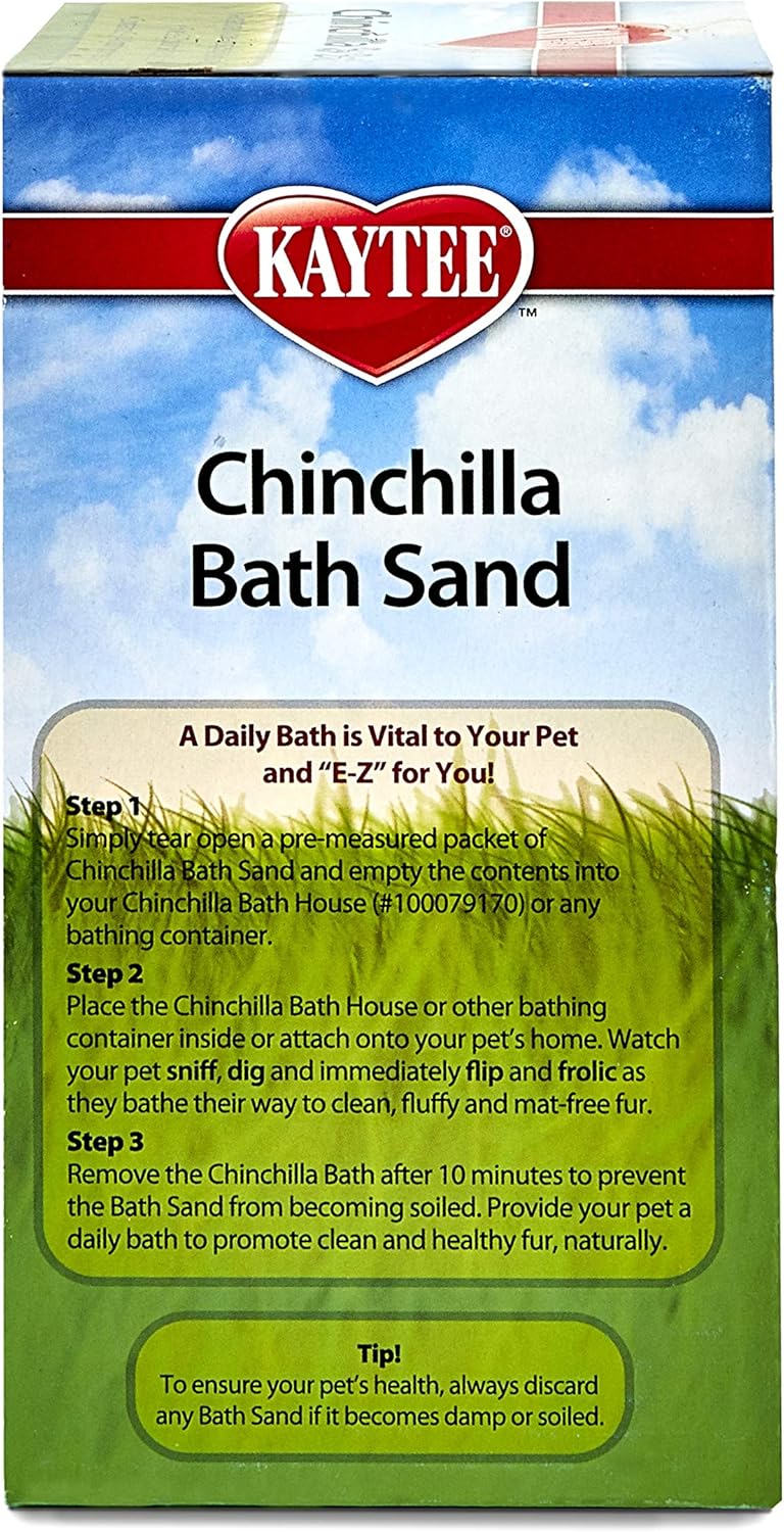 Chinchilla Bath Sand is a revolutionary idea in the care of chinchillas! Chinchilla Bath Sand is a superior alternative to the traditional chinchilla dust because its virtually dust free especially when used with your Kaytee Chinchilla Bath House. Bath sand is made from a 100-percent natural volcanic mountain pumice found in the Andes mountains, which is where your chinchilla's wild relatives are from. Each box of Chinchilla Bath Sand includes 5 ready-to-use easy to pour packets ensuring you use a perfect amount of sand every time.