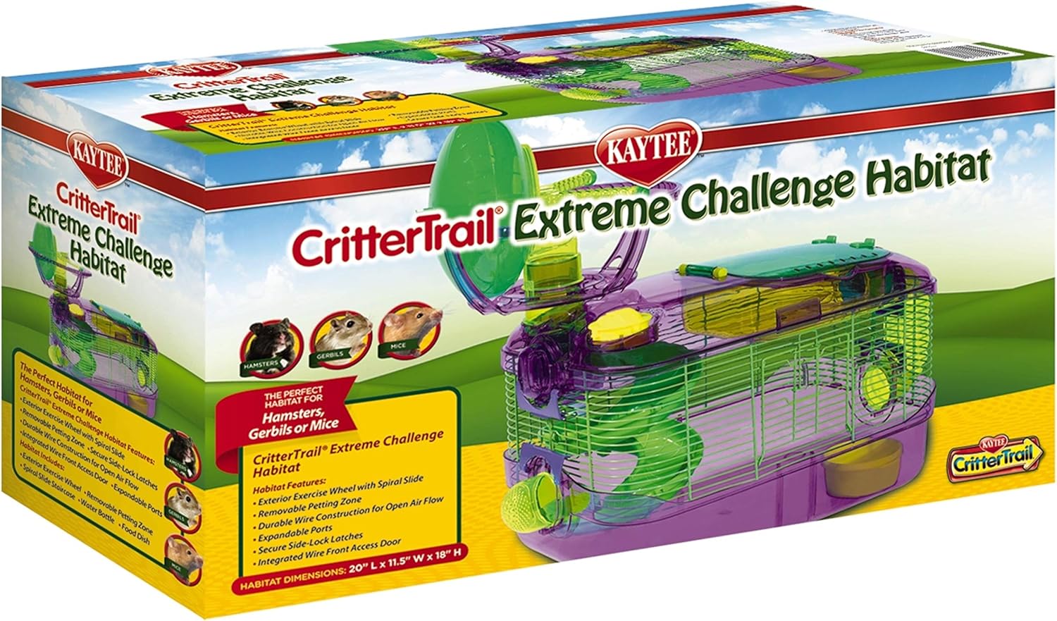 This complete habitat features an extreme exterior wheel and a fun spiral ramp to provide your pet with hours of extreme fun! The habitat also features a removable petting zone for instant interaction with your pet. This cage also comes with a food dish and water bottle for your convenience. Front wire door allows you to easily access your pet at any time. Ideal for mice, dwarf hamsters, hamsters and gerbils.