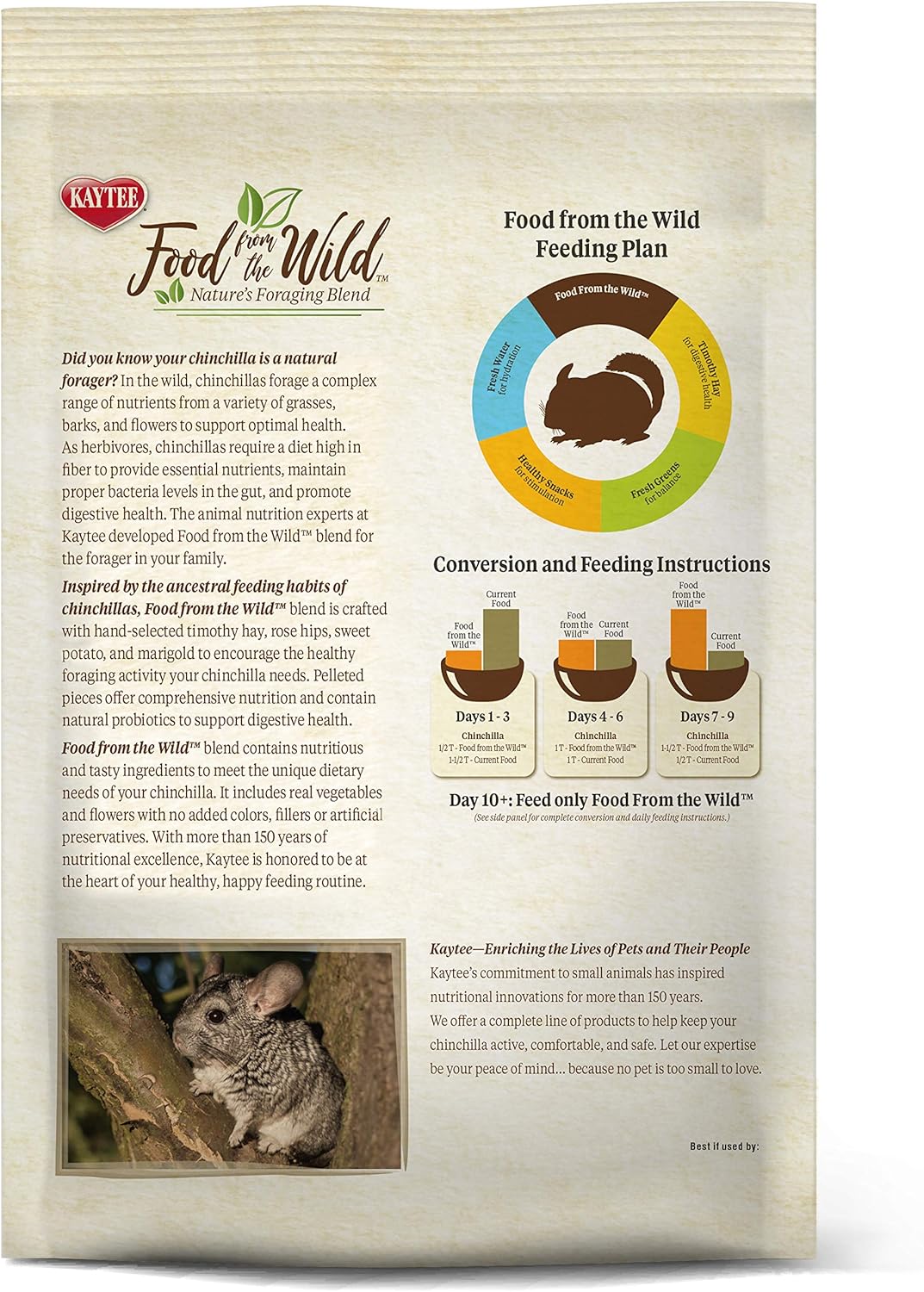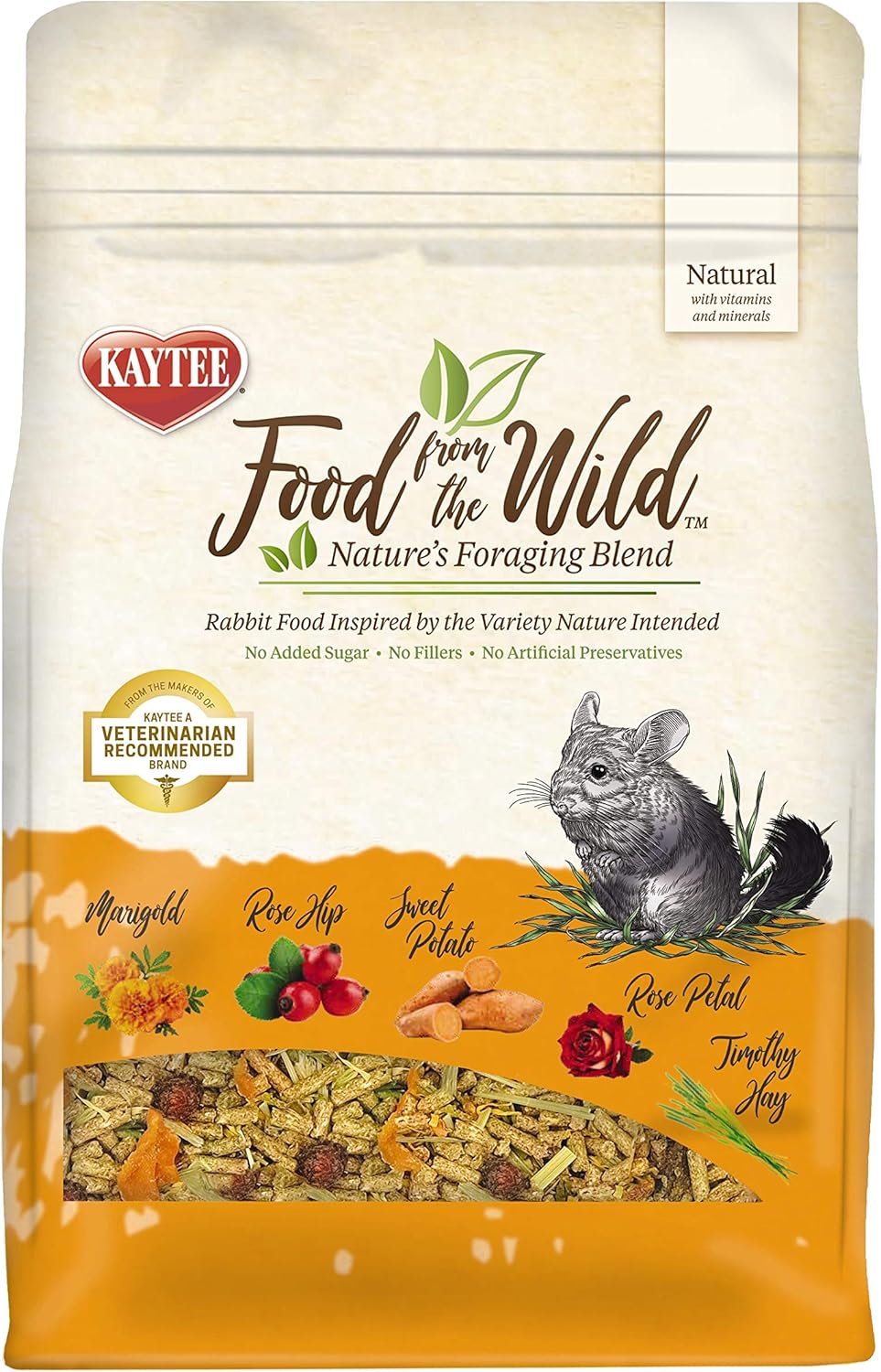 In the Wild, chinchilla forage a complex range of nutrients from a variety of grasses, barks, and flowers to support optimal health. As herbivores, chinchillas require a diet high in fiber to provide essential nutrients, maintain proper bacteria levels in the gut, and promote digestive health. The animal nutrition experts at Kaytee developed Food From the Wild blend for the forager in your family.