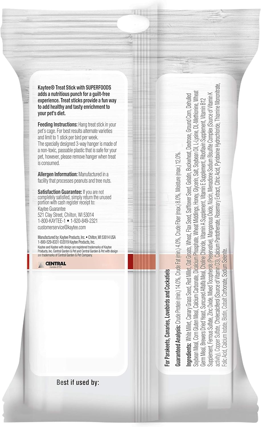 Kaytee Treat Stick with SUPERFOODS adds a nutritious punch for a guilt free experience. Treat sticks provide a fun way to add healthy and tasty enrichment to your pet's diet. The blend of fresh palatable seeds and grains are fortified with rich in antioxidants, Vitamins, and Fiber. Superfood Treat Sticks are made with no artificial colors or preservative. Kaytee understands that sharing your life with a pet bird is not only enjoyable but very enriching. Here at Kaytee, your pet is our top priority. We know how important your animal is to you, and we want to make sure everything you need is right at your fingertips. Kaytee shows our love by ensuring we provide your pet bird with the best nutrition for a long and healthy life. With over 150 years of avian nutritional experience, it's no wonder why Kaytee is at the heart of every healthy feeding routine.