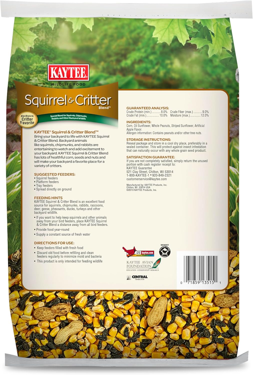Kaytee Squirrel and Critter Blend is a mix of quality grains and seeds designed to attract squirrels, chipmunks and other backyard critters and provides an alternative to help keep them satisfied and away from bird feeders.