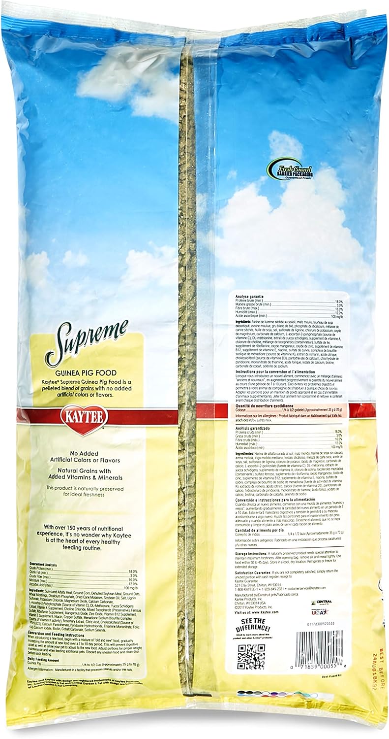 Kaytee Supreme Guinea Pig food is a wholesome, high-quality mix that contains all of the natural protein, fiber, oils and nutrients of whole grains. Fortified to ensure a balance blend, Supreme utilizes natural seeds, grains and pellets to provide your small pet with a simple yet healthy diet. Kaytee Supreme offers high quality ingredients small animals love and the nutrition they require.
