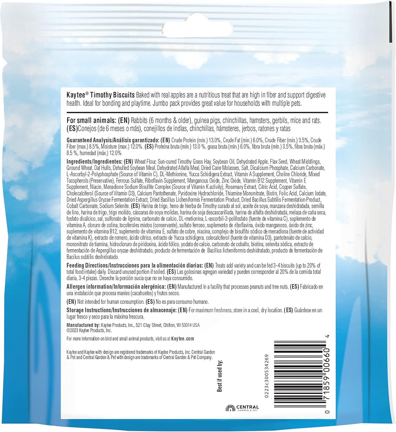 Kaytee Timothy Biscuits Baked with Apples are a healthy and delicious treat that cater to your small animal's natural chewing instincts. These biscuits are packed with the natural high fiber of timothy grass hay, promoting optimal digestion and overall wellbeing. The apple flavor is sure to tantalize your pet's taste buds, providing a flavorful snacking experience they will love. Kaytee Timothy Biscuits Baked with Apples are perfect for placing in a dish or hand feeding, providing a fun and interactive way to bond with your furry friend. However, it's important to remember that treats should only be given in moderation to avoid overfeeding. These treats are ideal for bonding and playtime with your small animal!