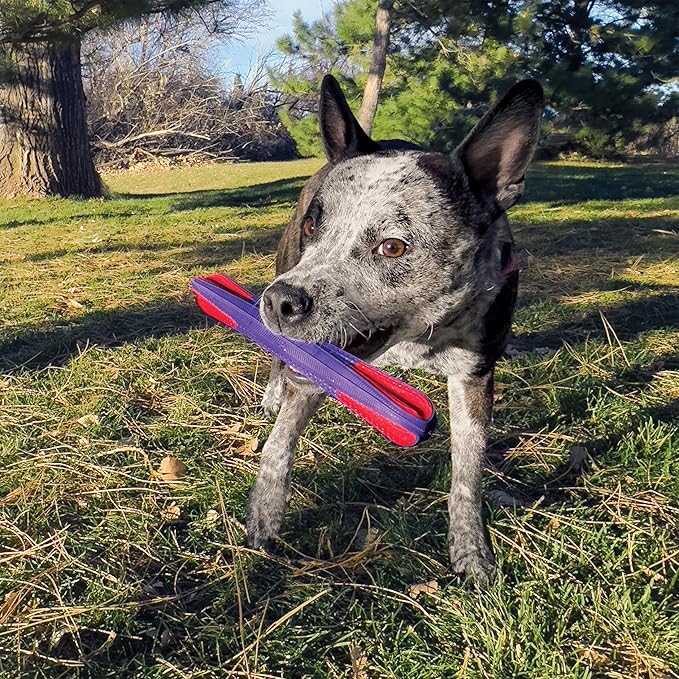 Dual colors, textures & materials provide multiple sensory stimulation Interactive squeaking fetch toy entices play Unique curves...