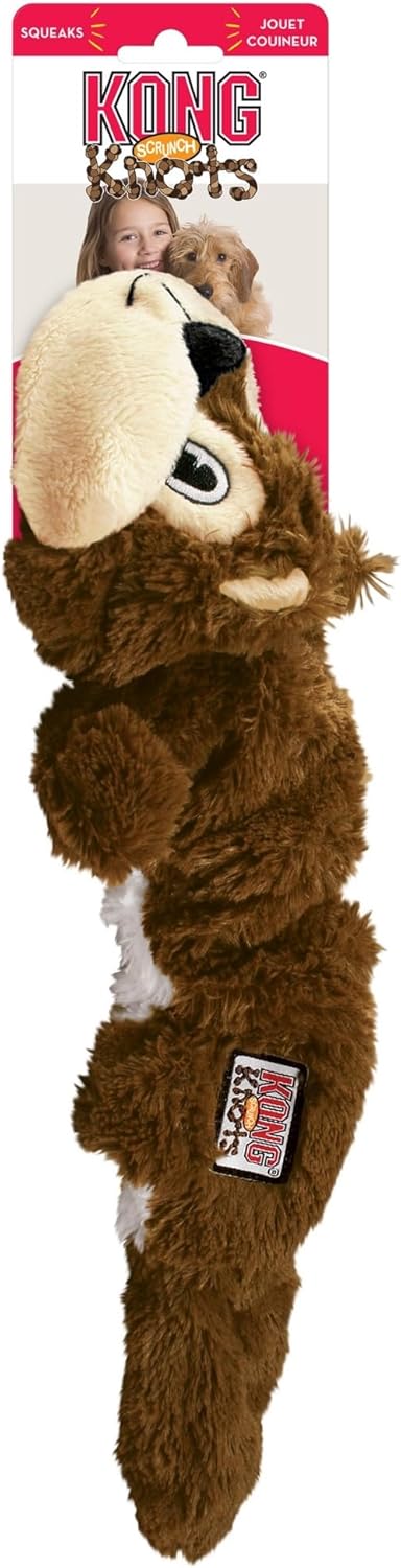 The KONG Scrunch Knots Squirrel is a durable, realistic pelt-style plush toy designed for medium to large dogs. With internal knotted ropes and minimal stuffing, it offers tugging, chewing, and shaking fun while keeping mess to a minimum.